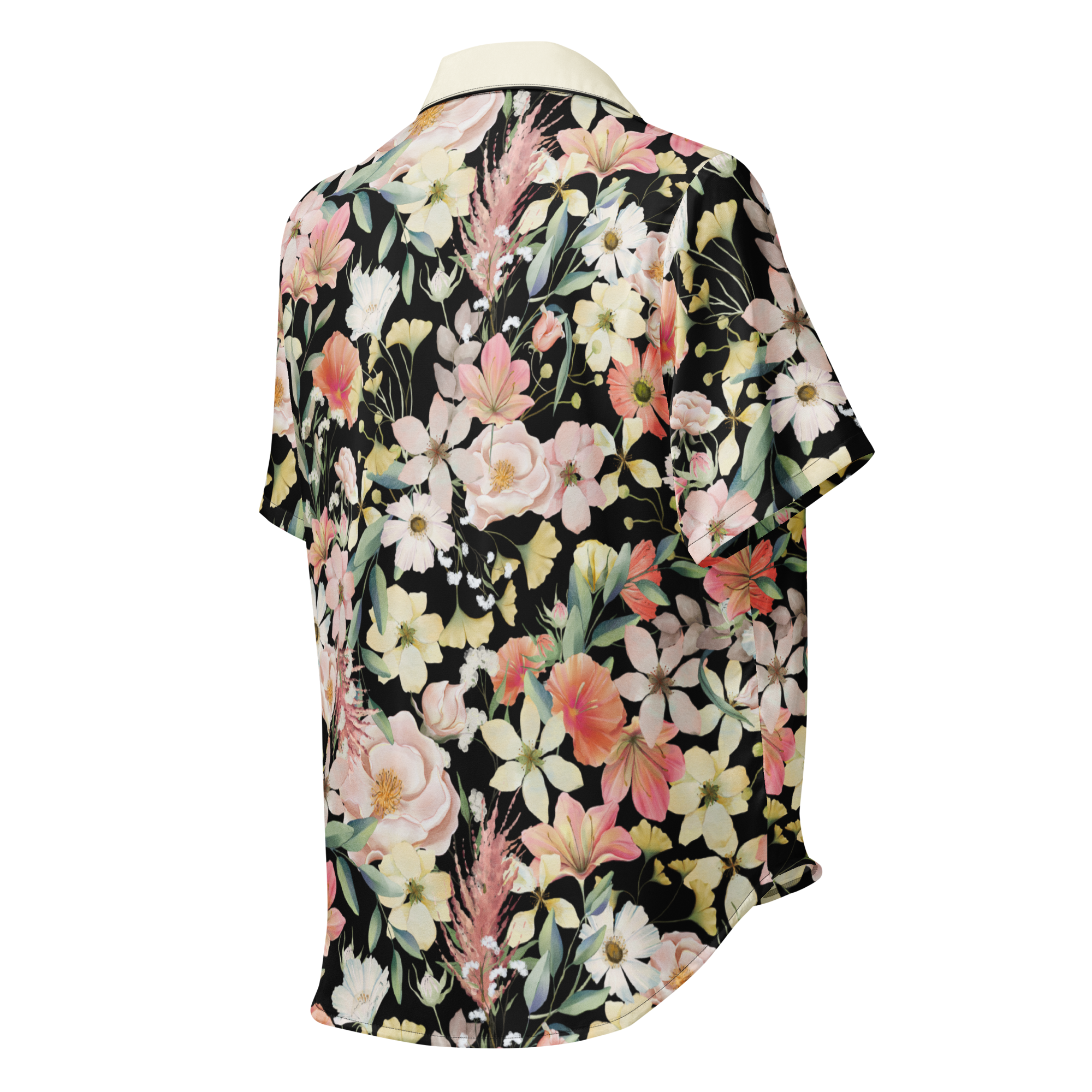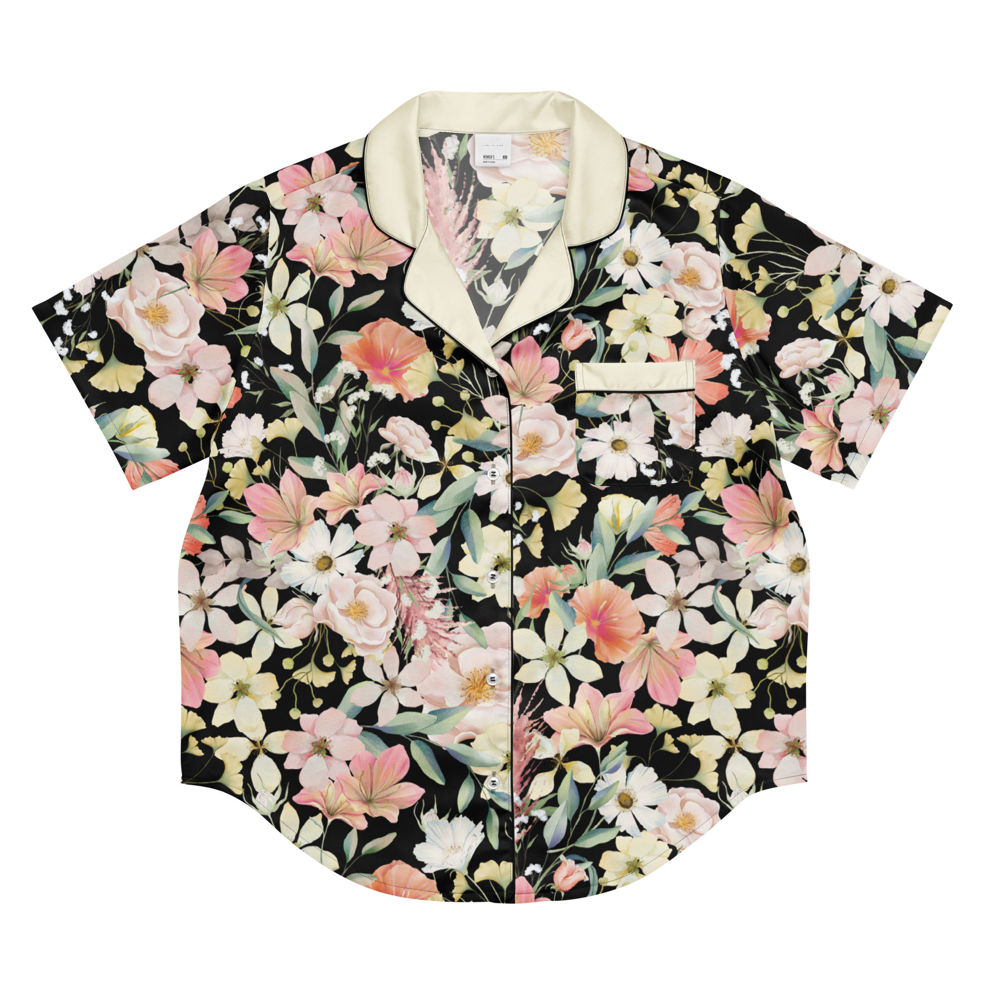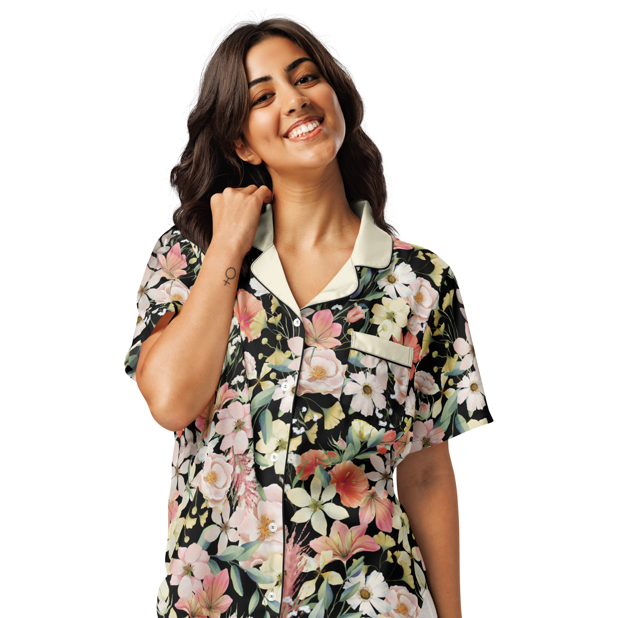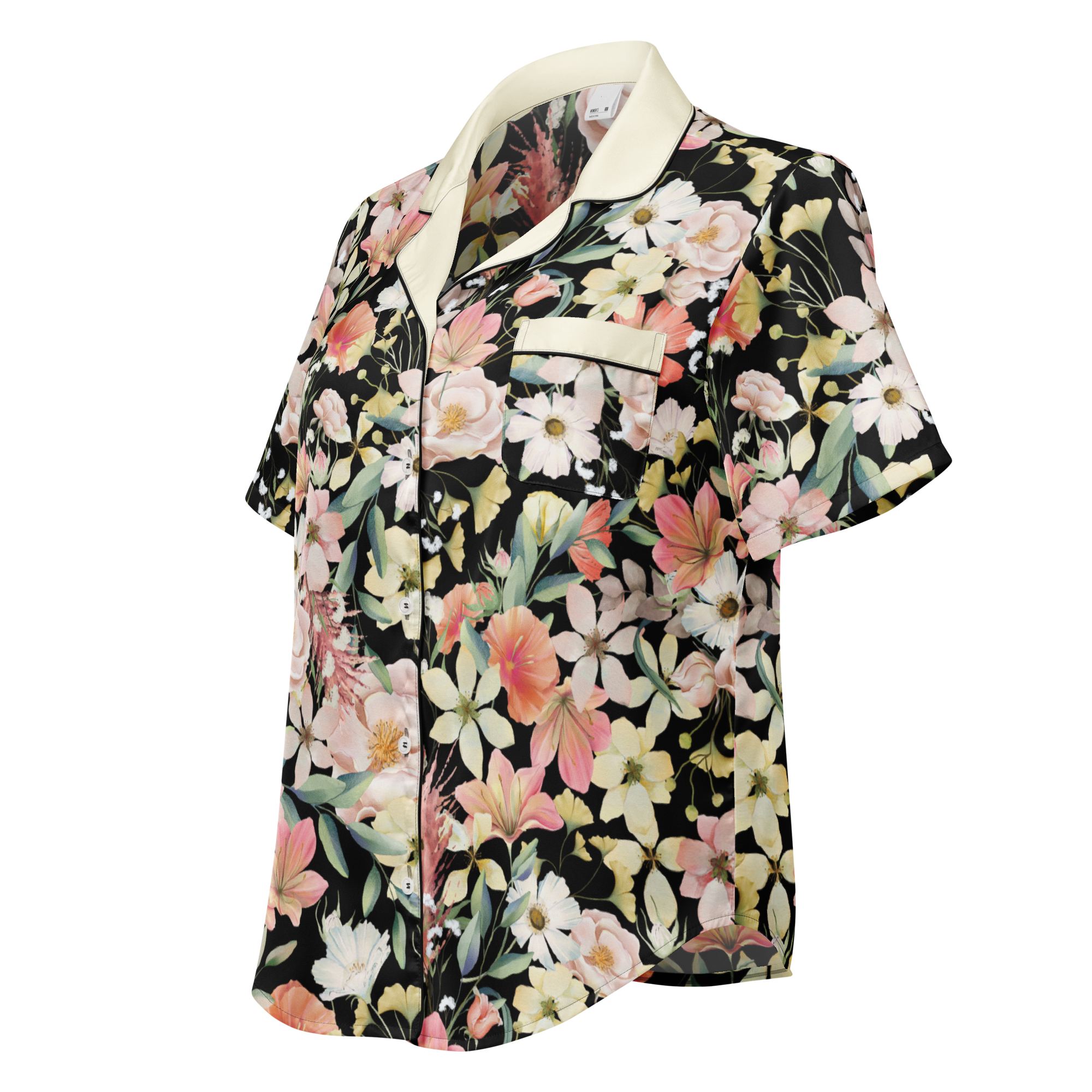 Floristi Women’s Short Sleeve Pajama Top - Black/Apricot White Details/Black Piping