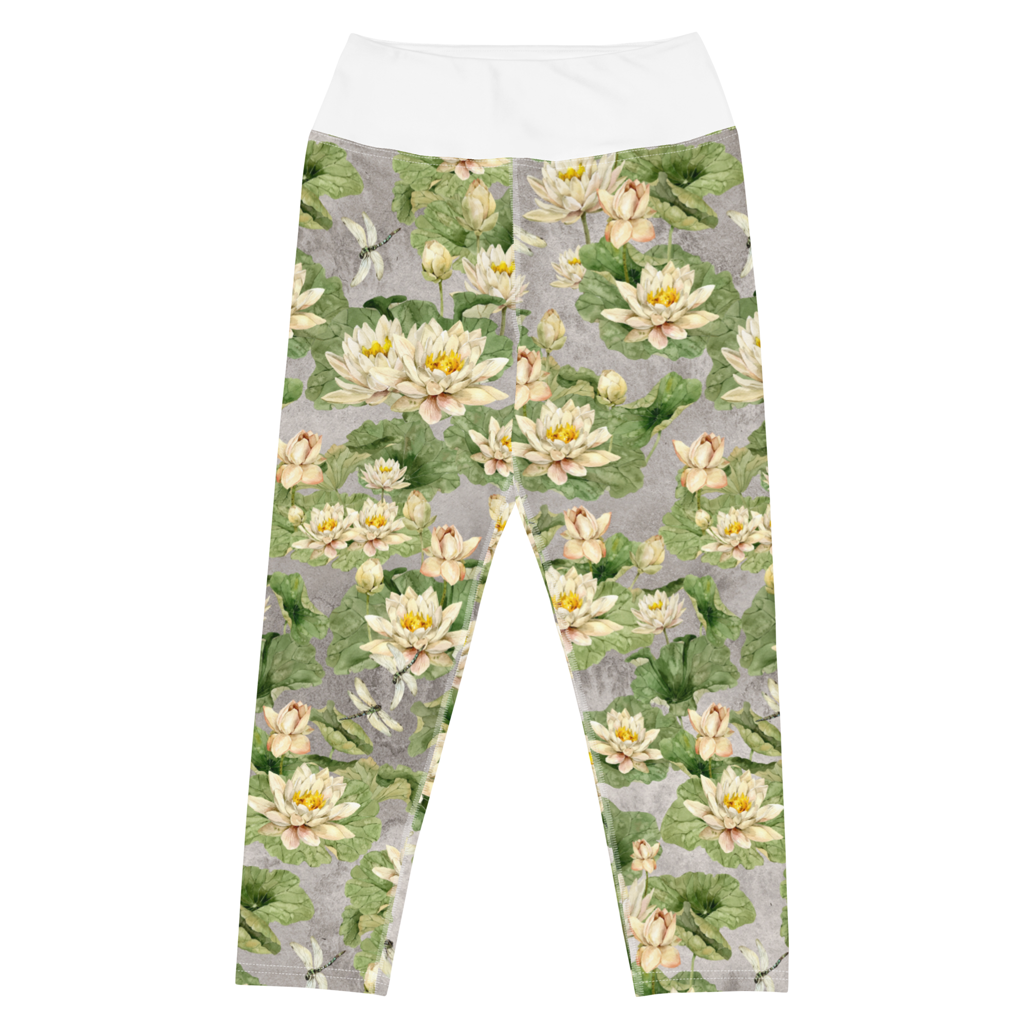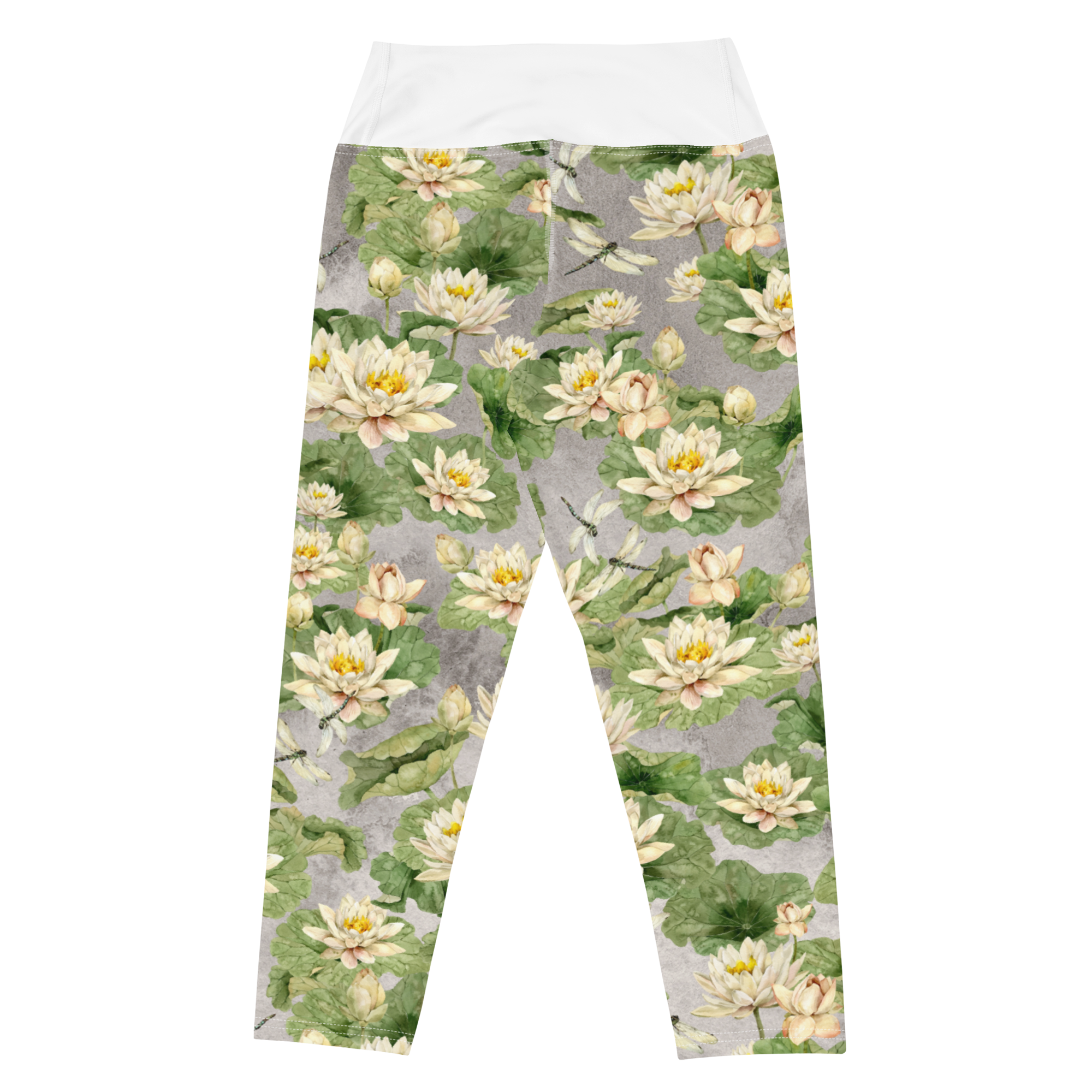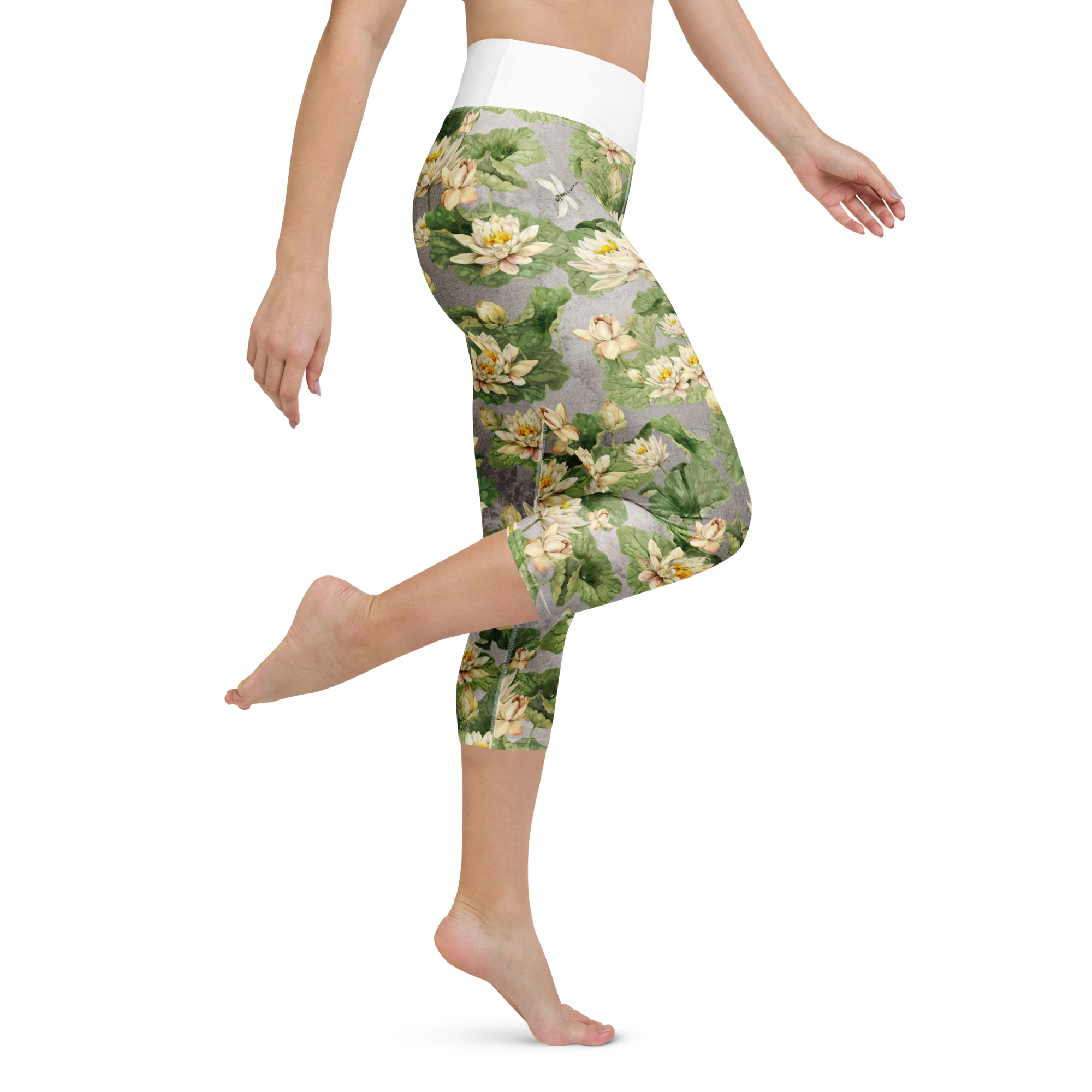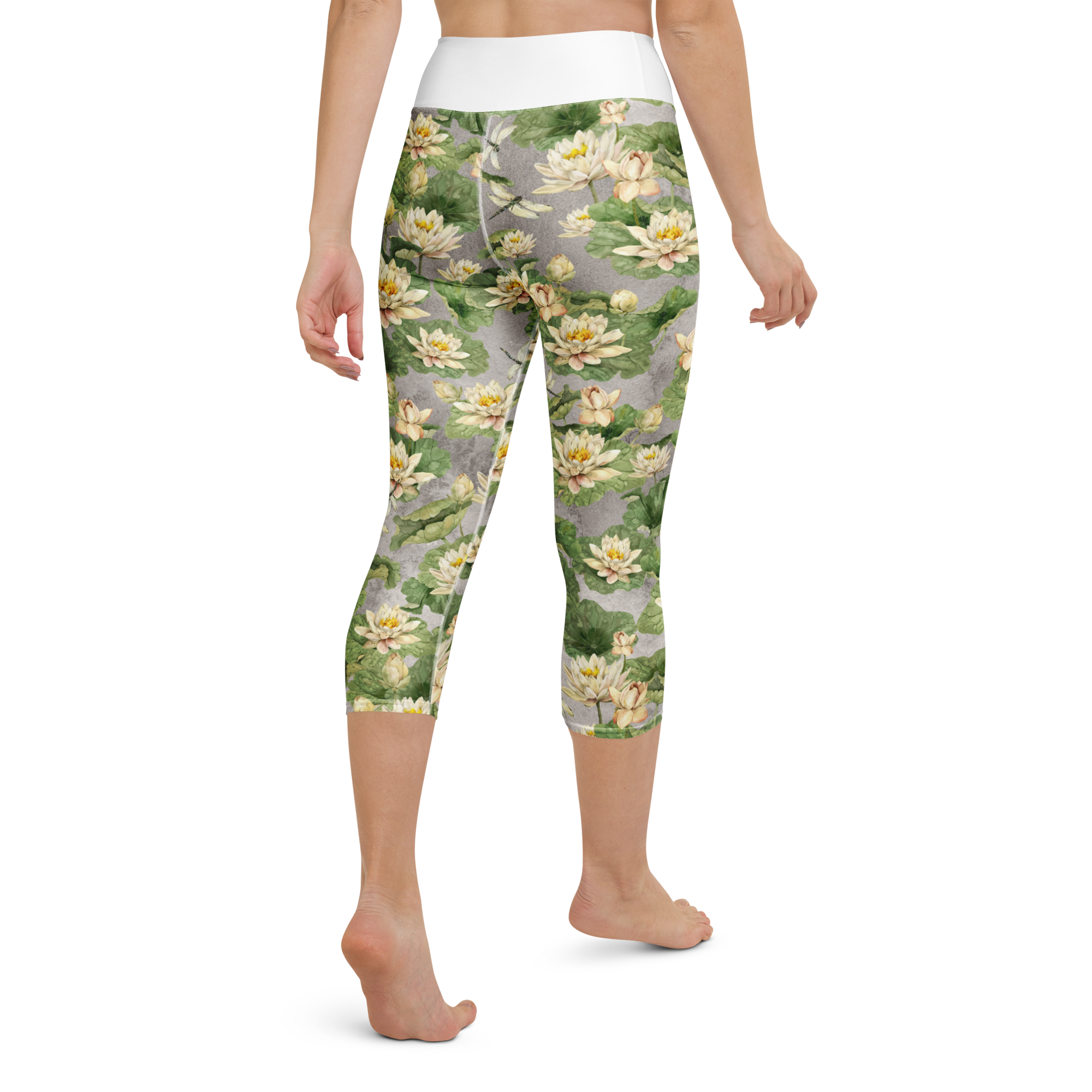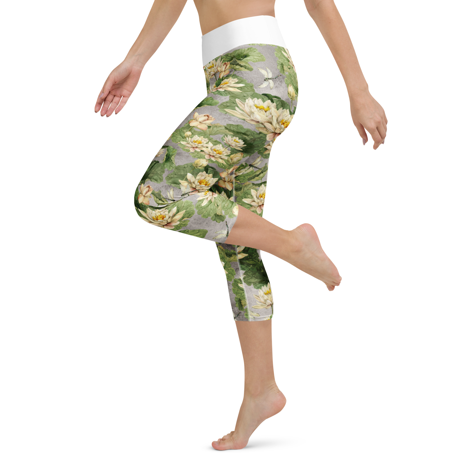 Lilies in the Mist Yoga Capri Leggings - White Waistband