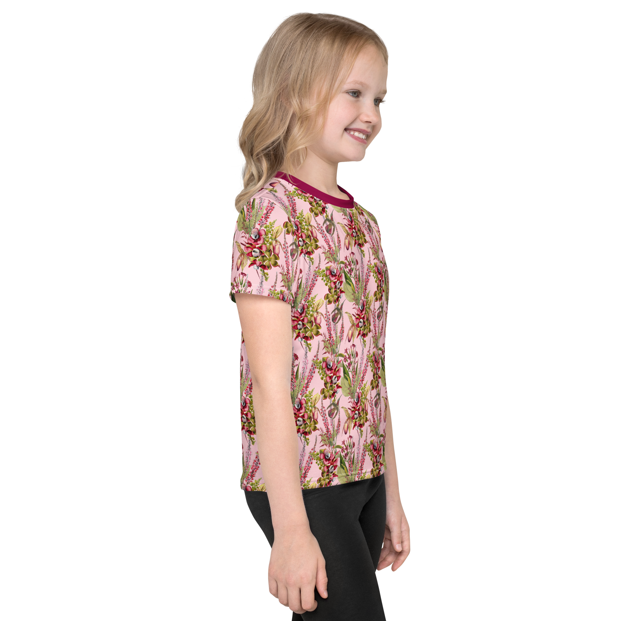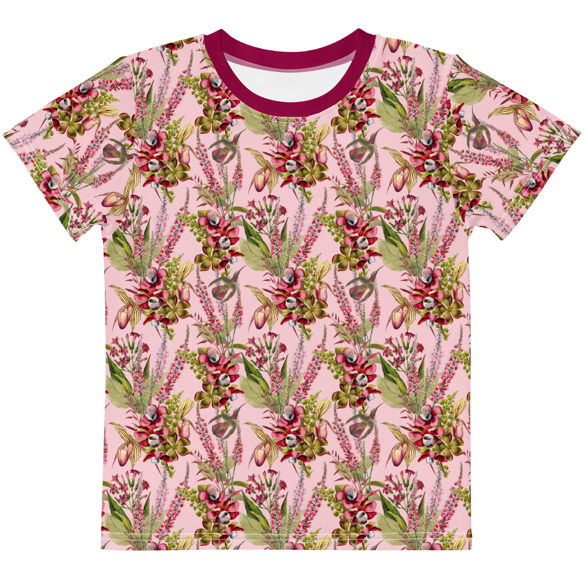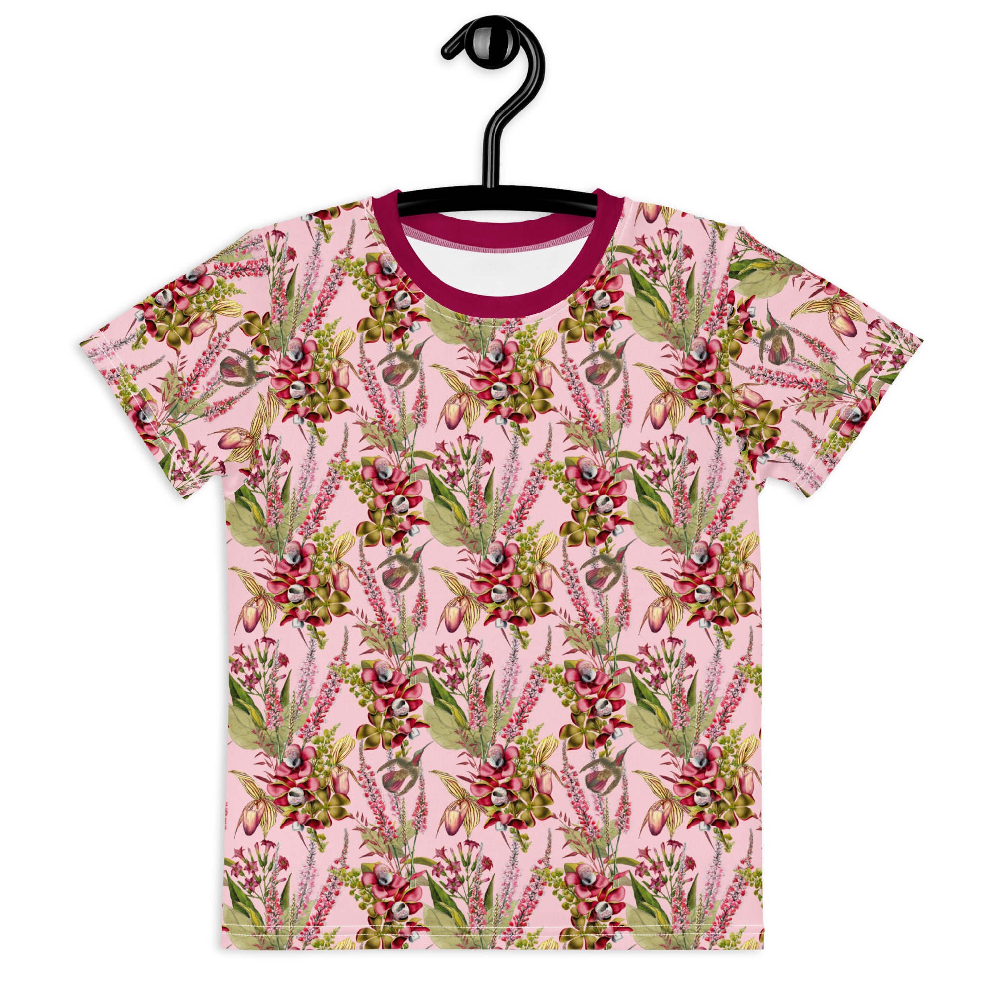 Pink Blossom Kid's Crew Neck T-shirt - X-small Print - Pale Pink/Burgundy Trim