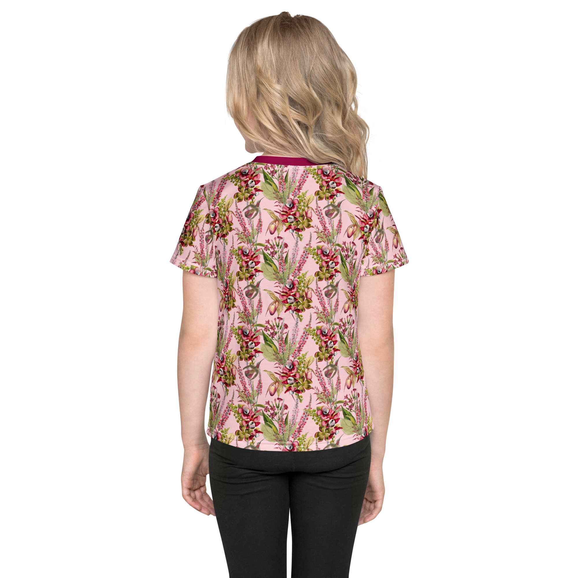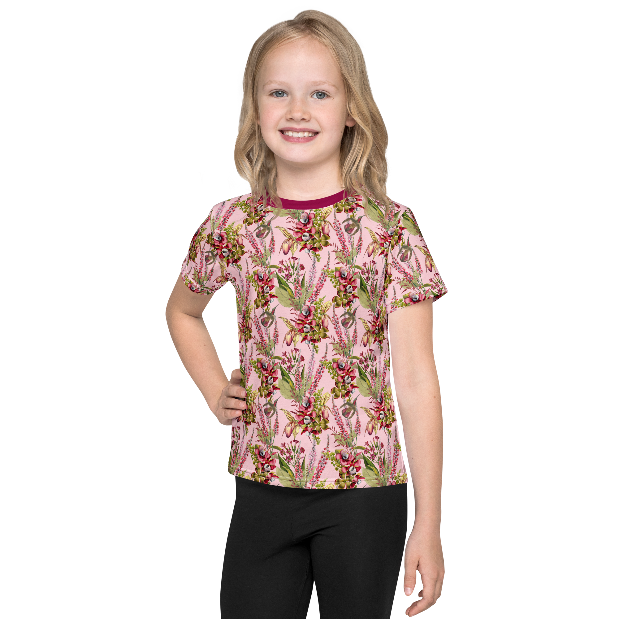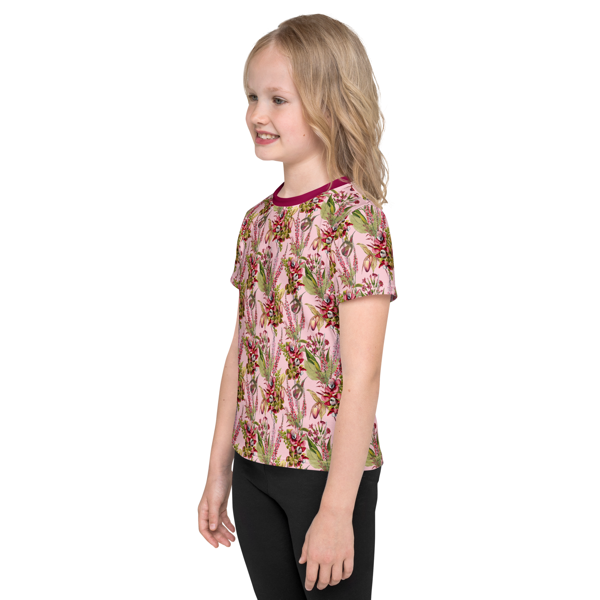 Pink Blossom Kid's Crew Neck T-shirt - X-small Print - Pale Pink/Burgundy Trim