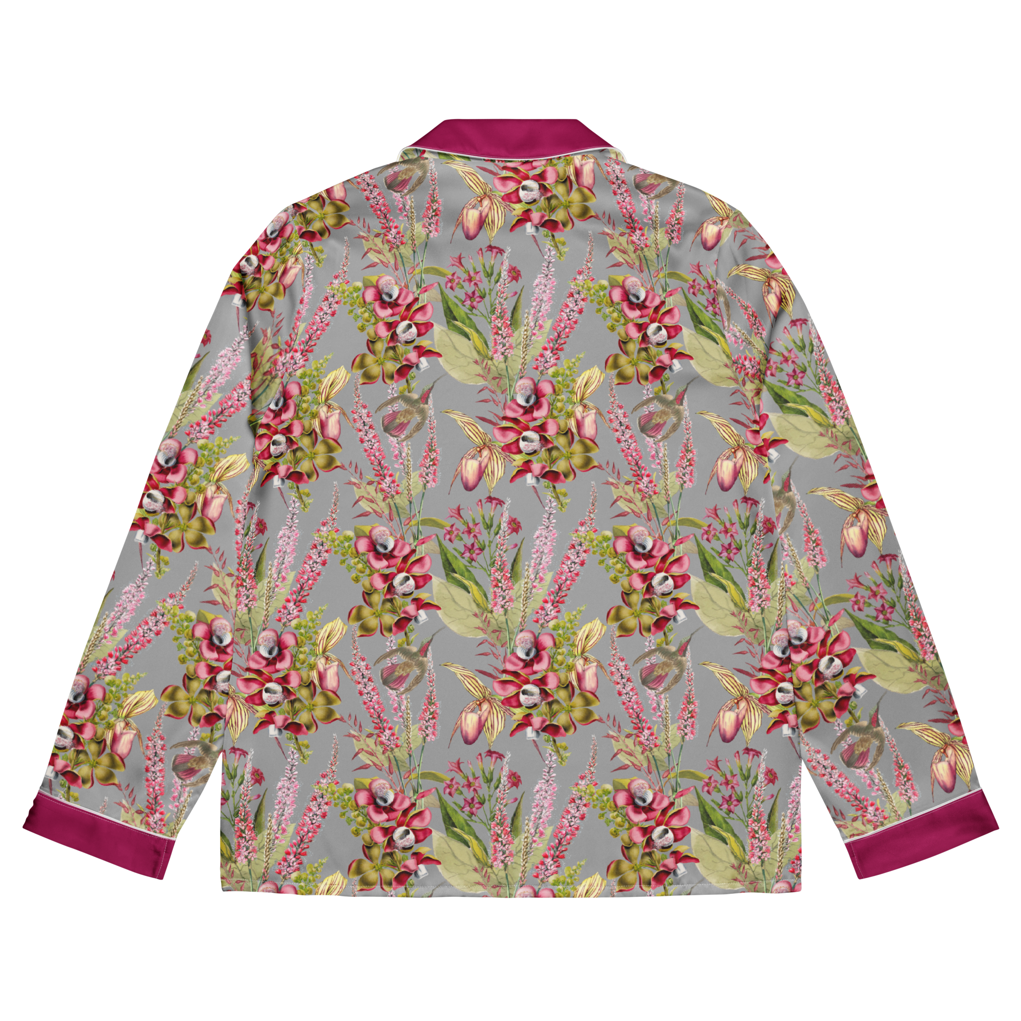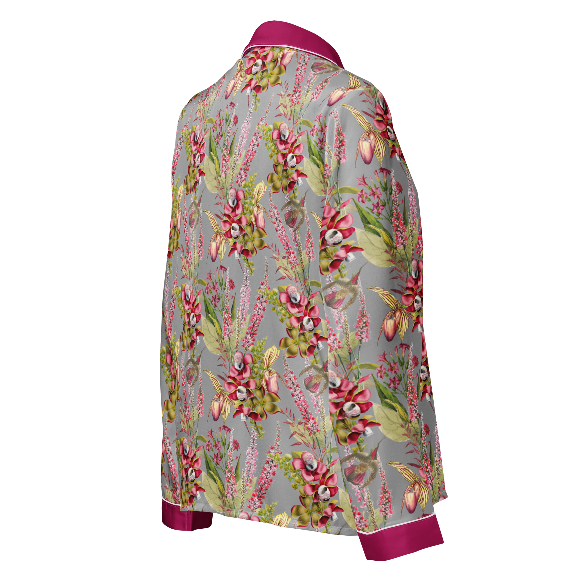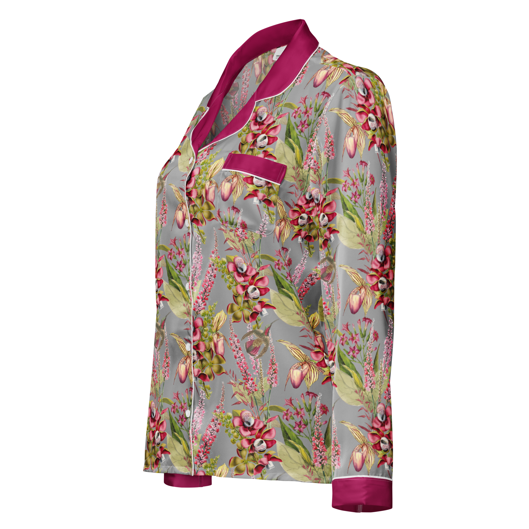 Pink Blossom Women’s Long Sleeve Pajama Top - Nobel/Burgundy Details/White Piping