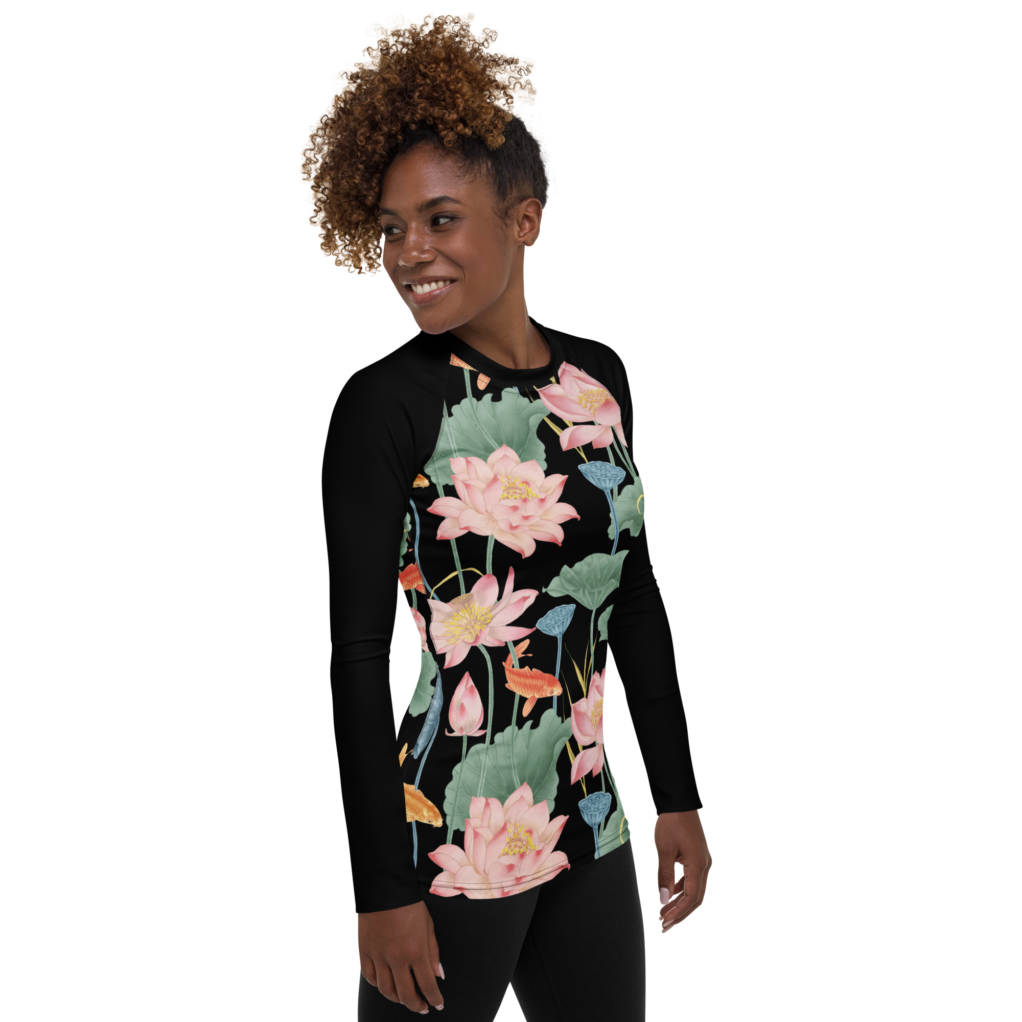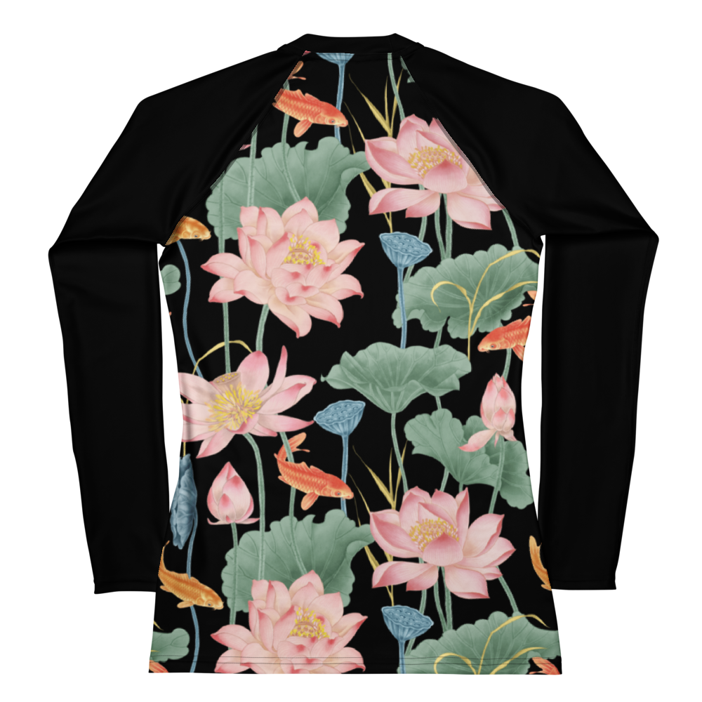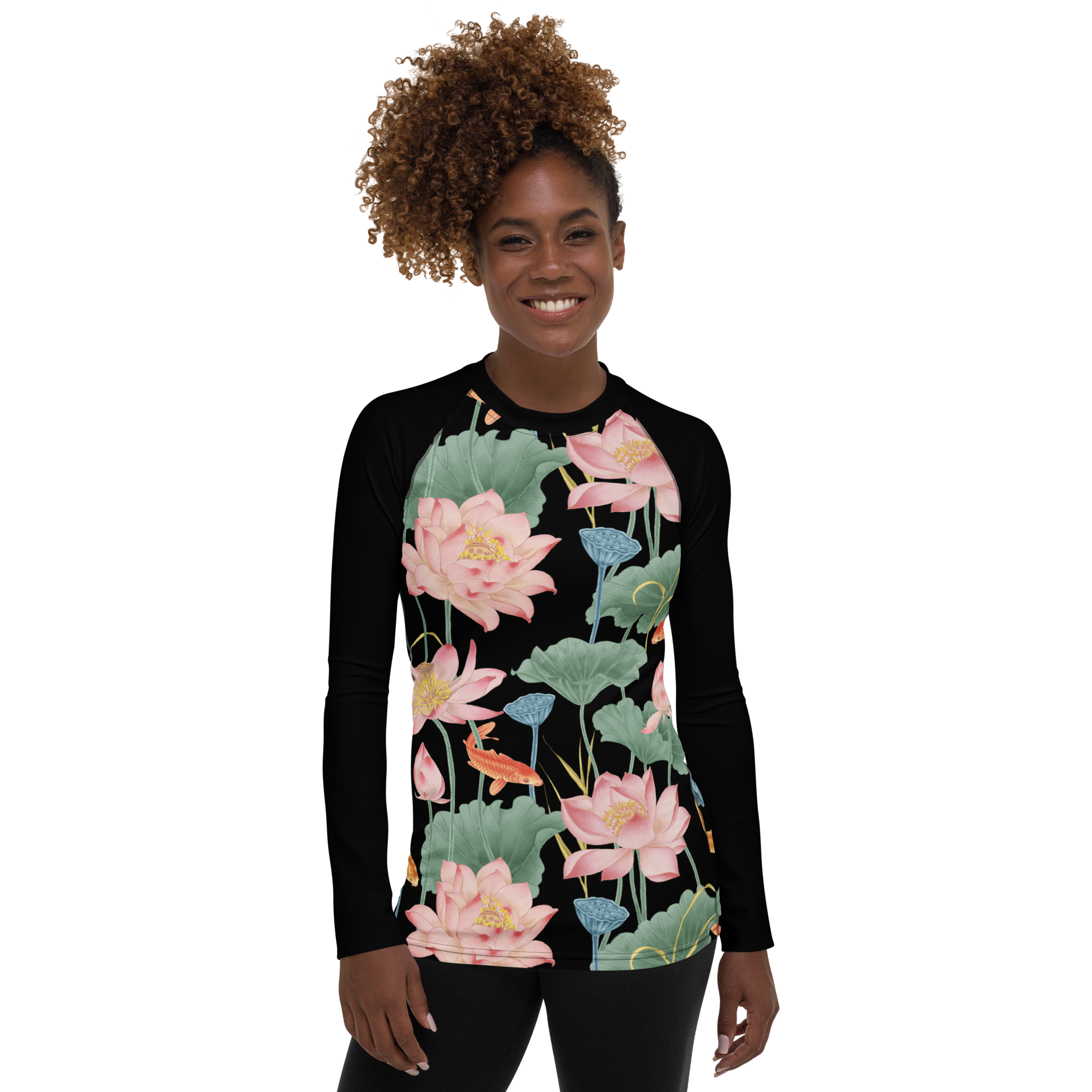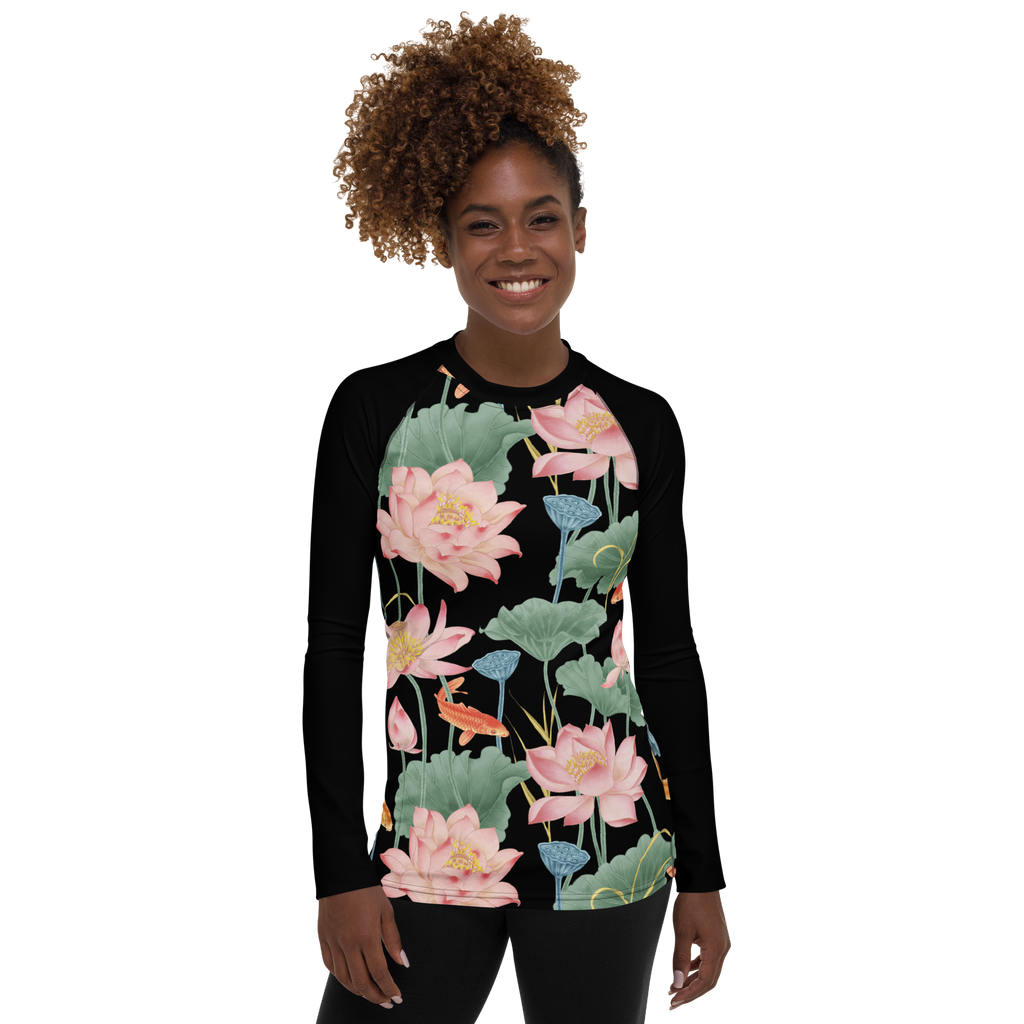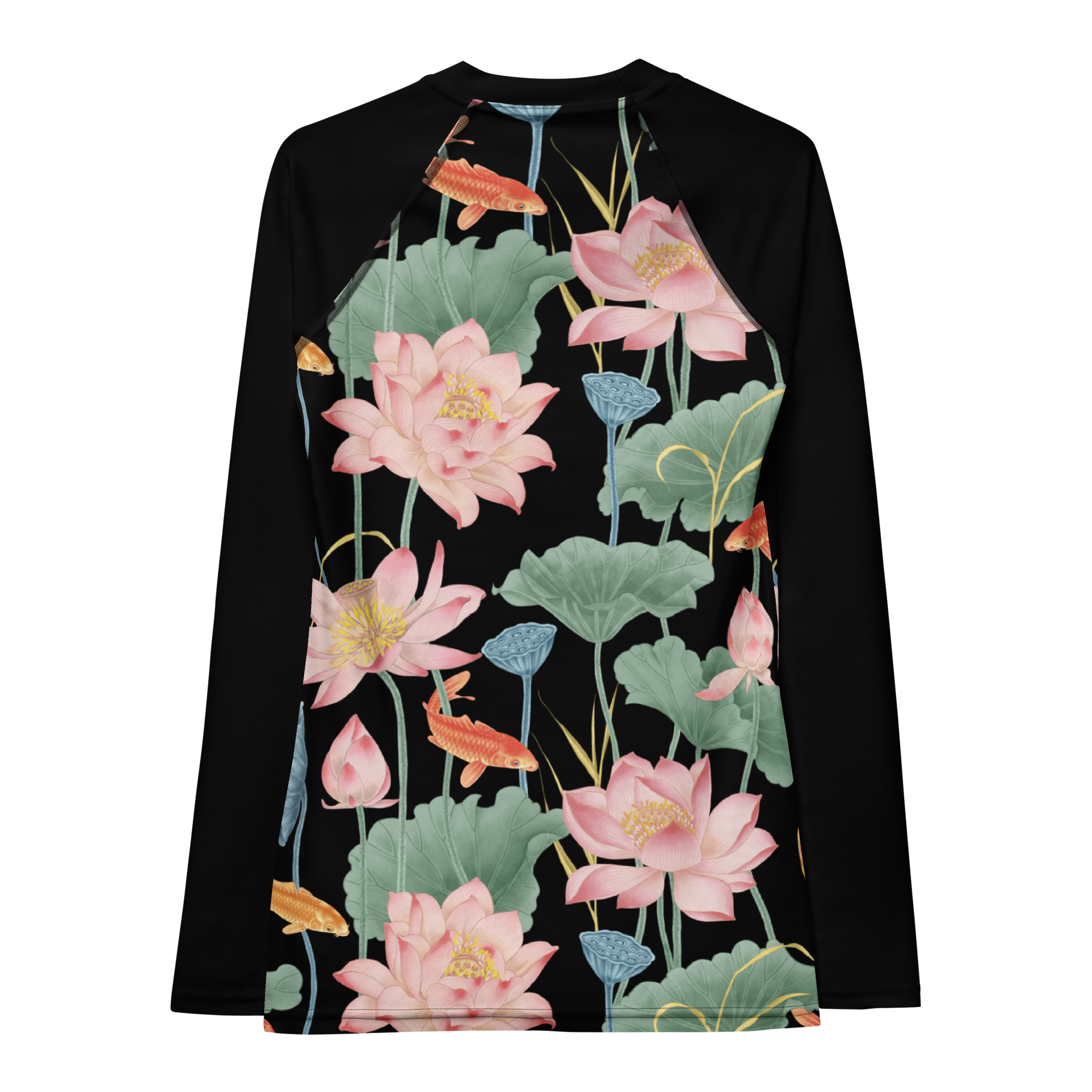 Lotus Luxe Women's Rash Guard - Large Print - Black/Solid Black Sleeves