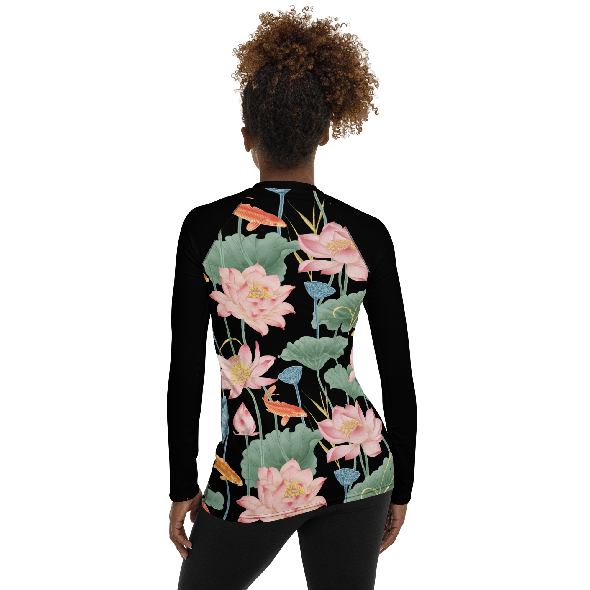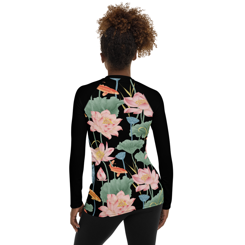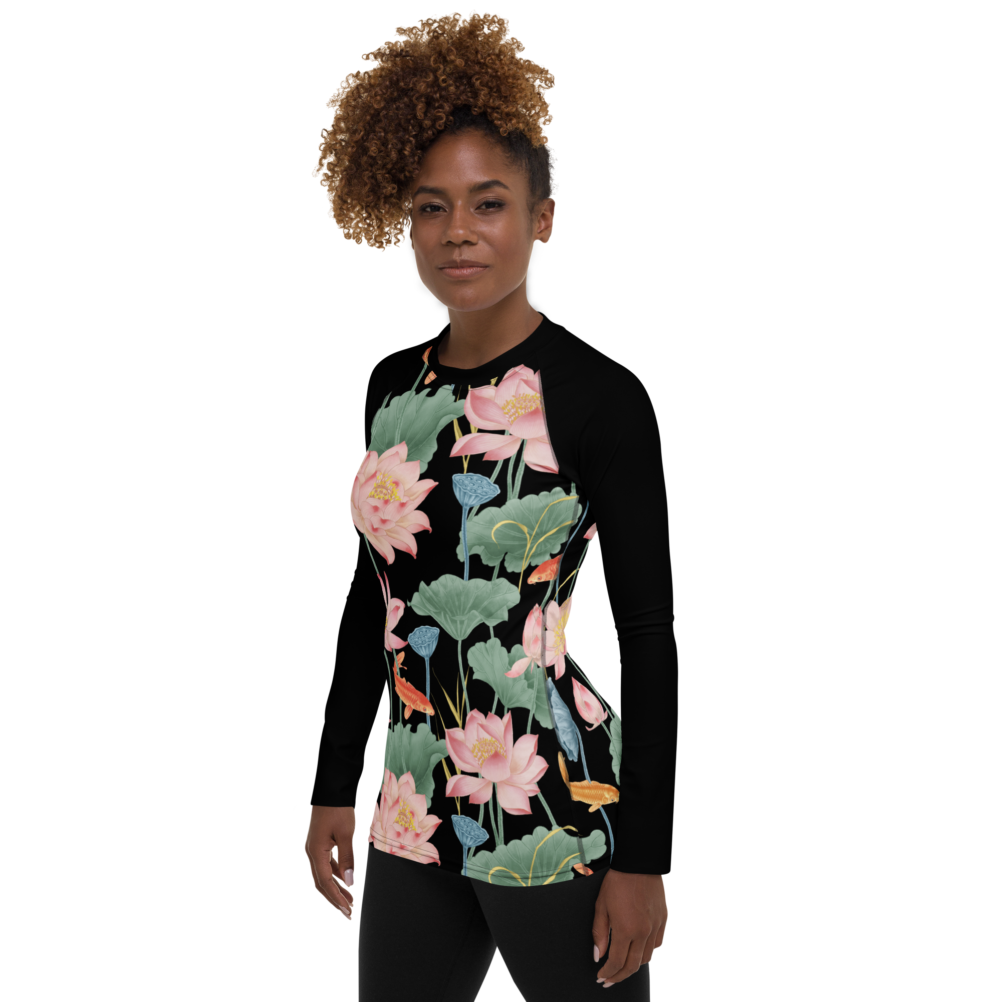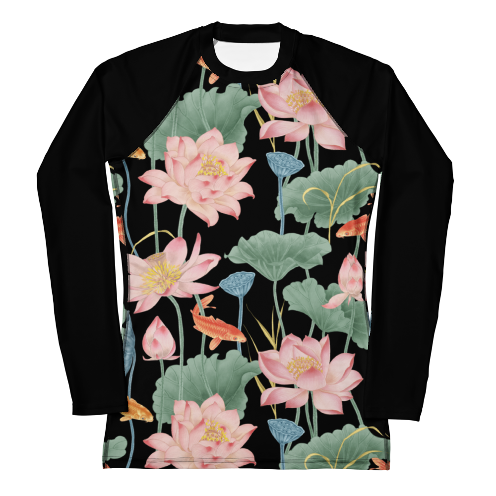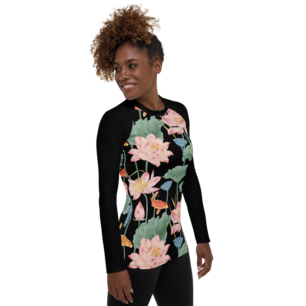 Lotus Luxe Women's Rash Guard - Large Print - Black/Solid Black Sleeves