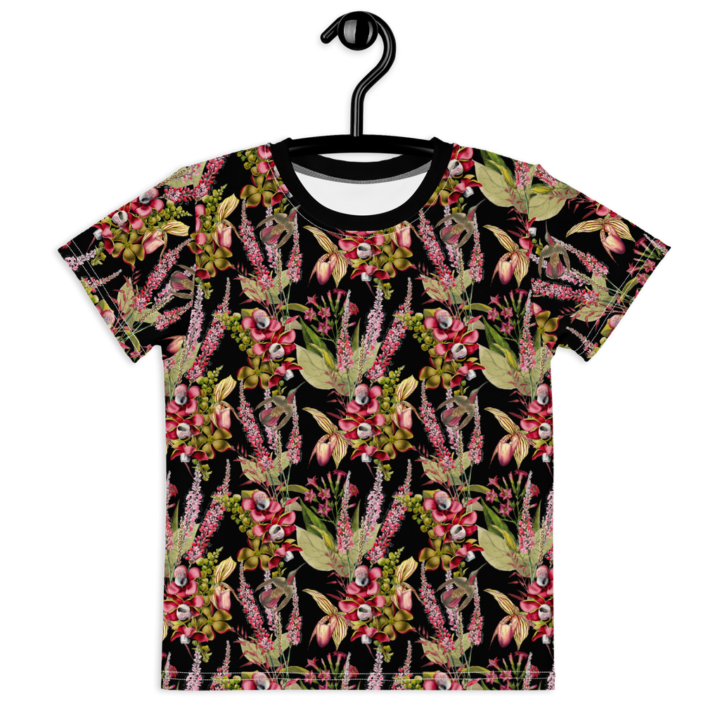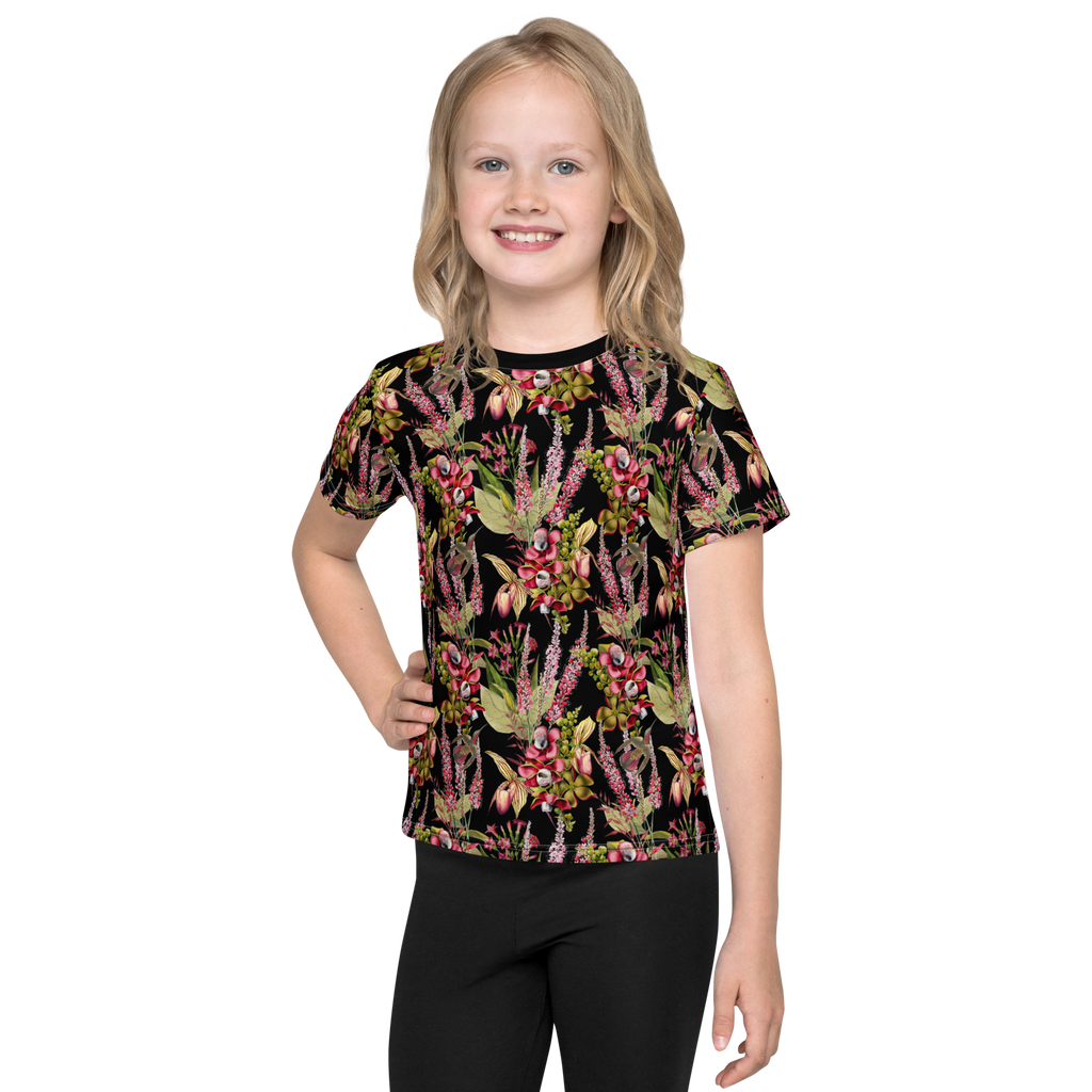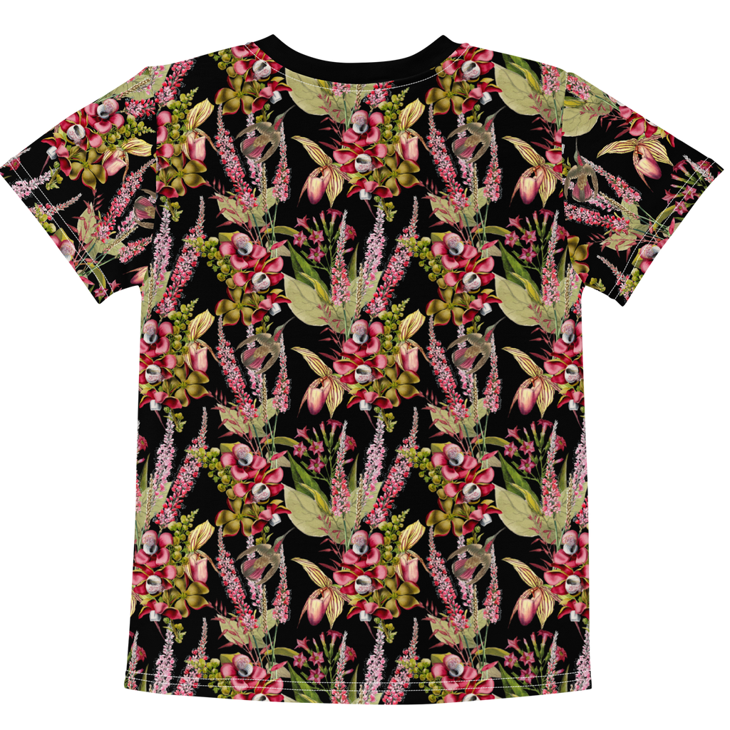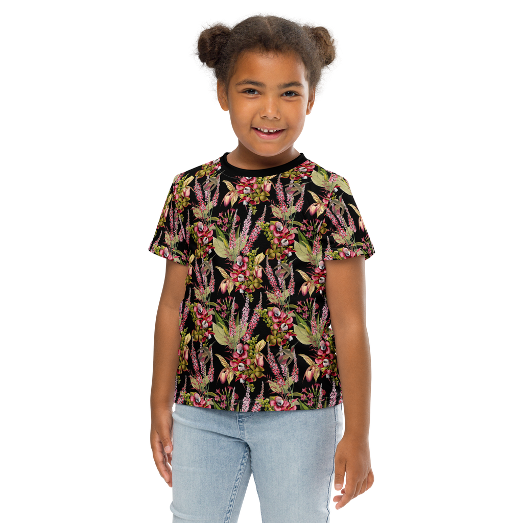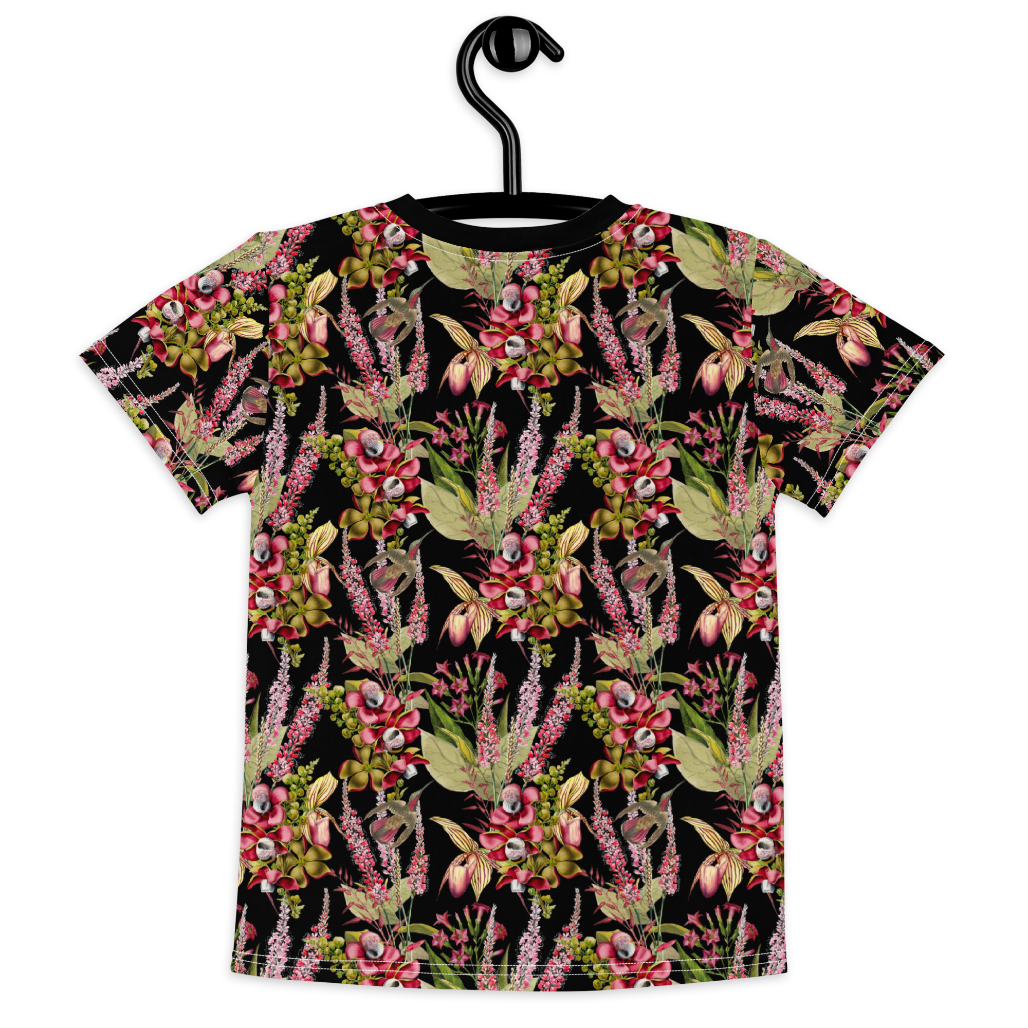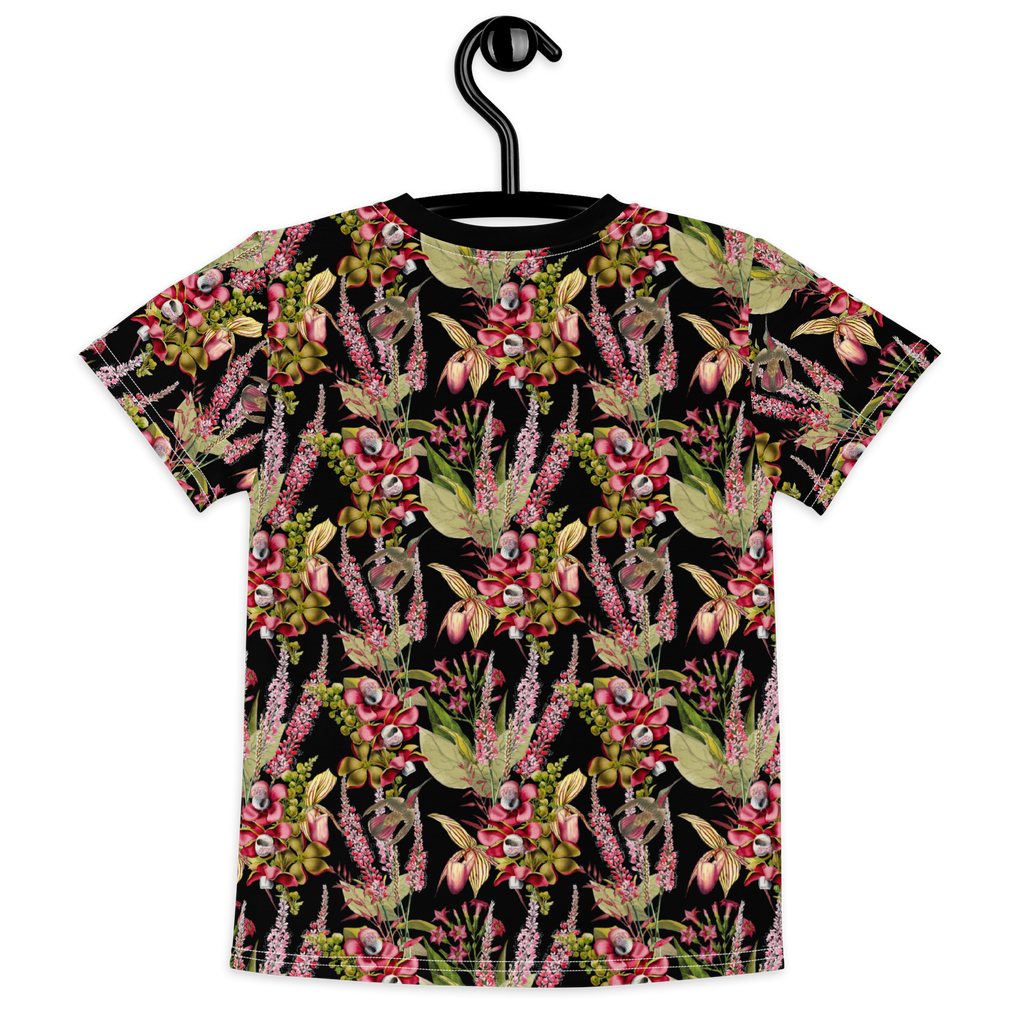 Pink Blossom Kid's Crew Neck T-shirt - Small Print - Black