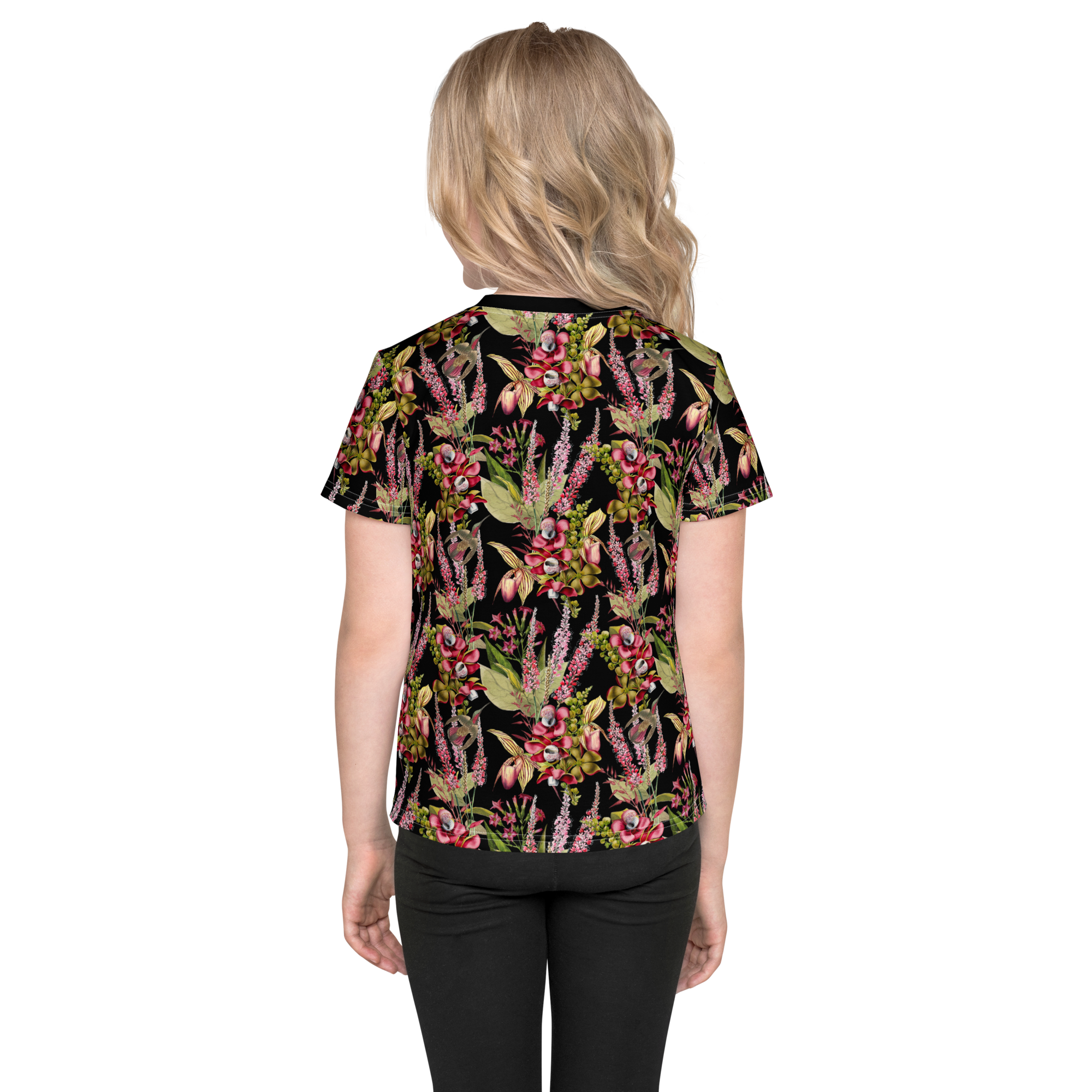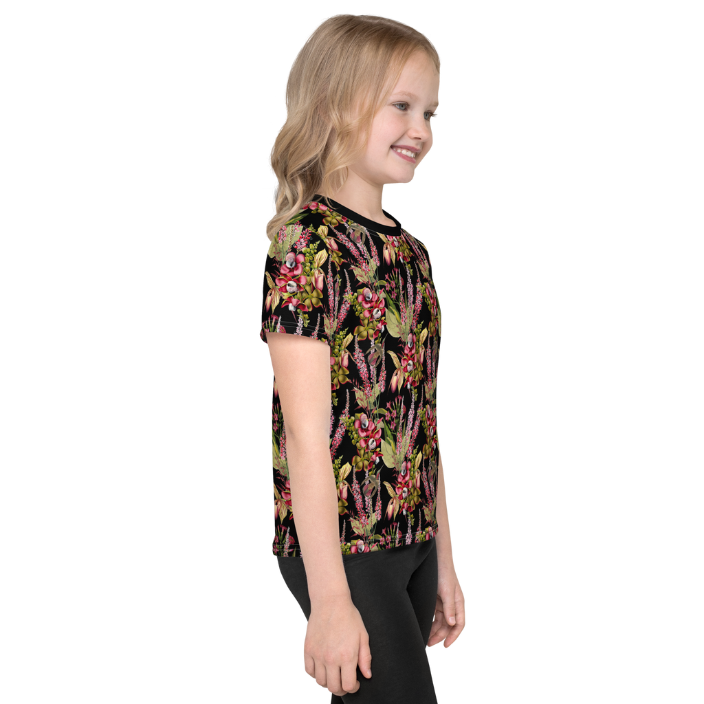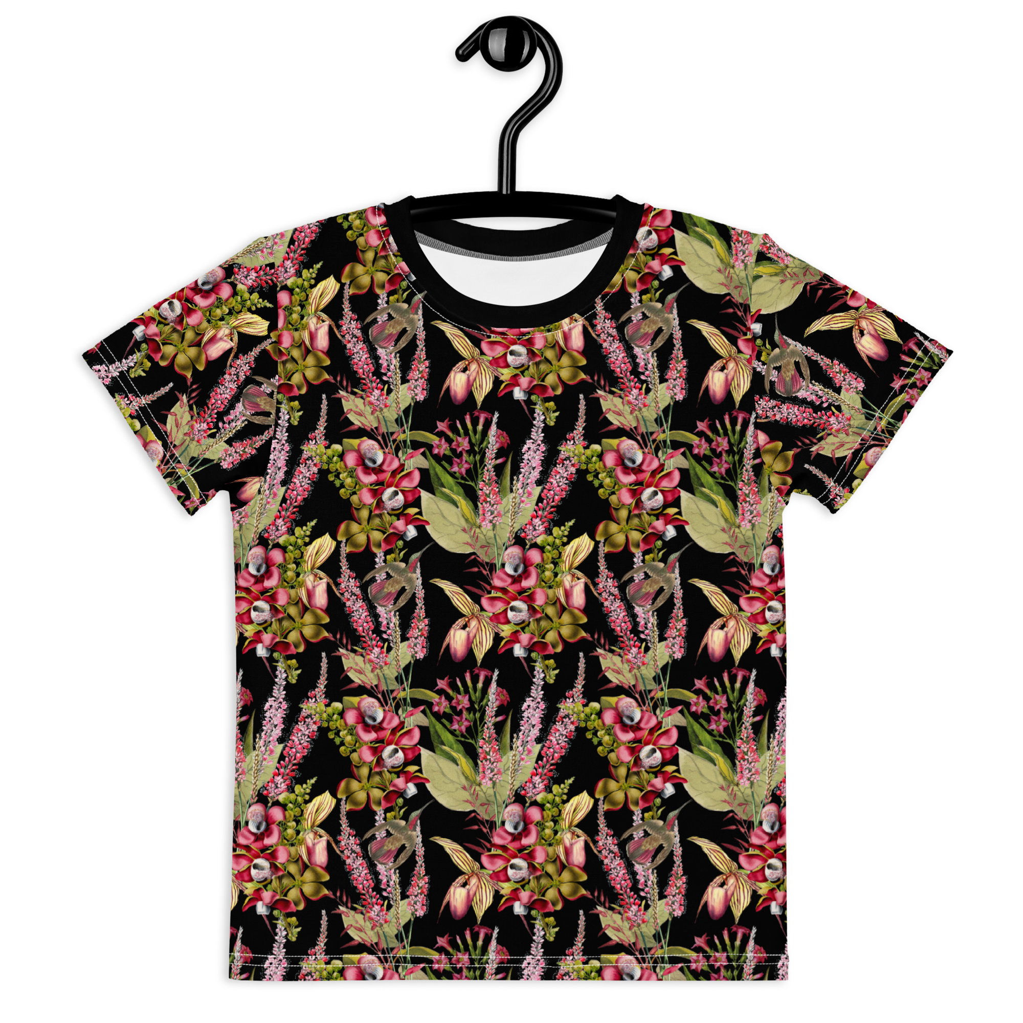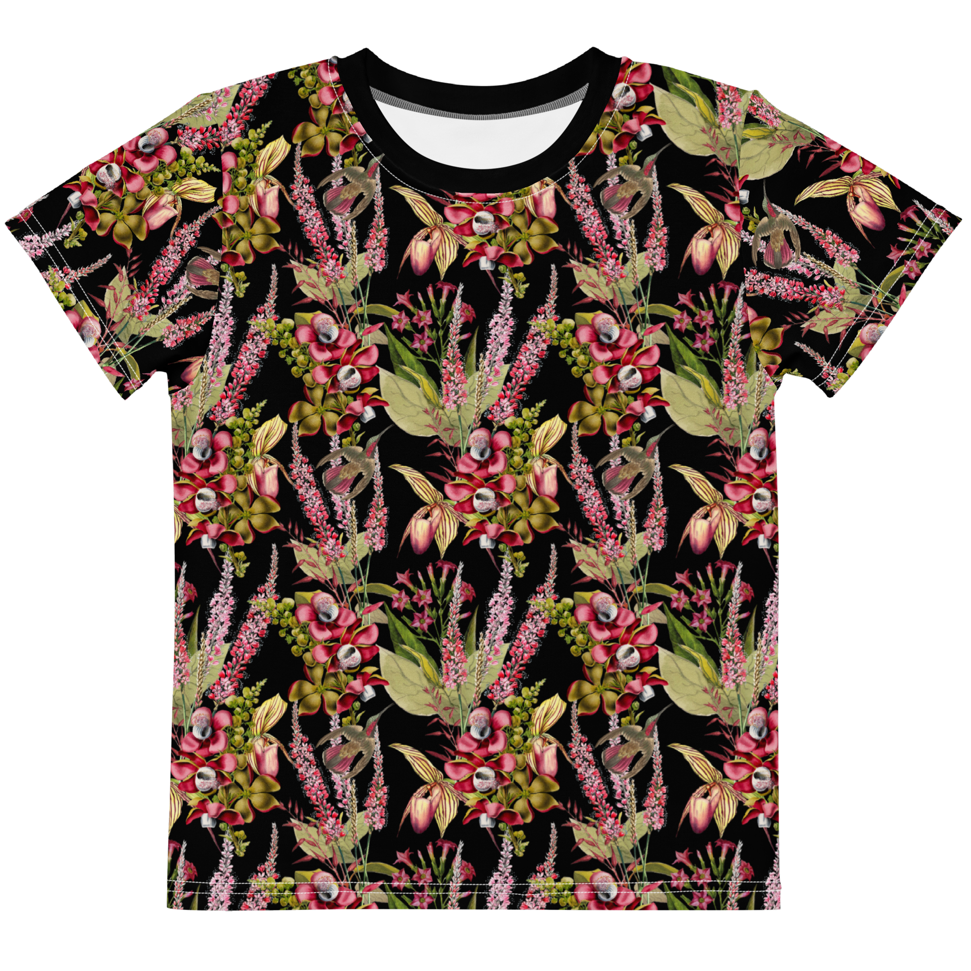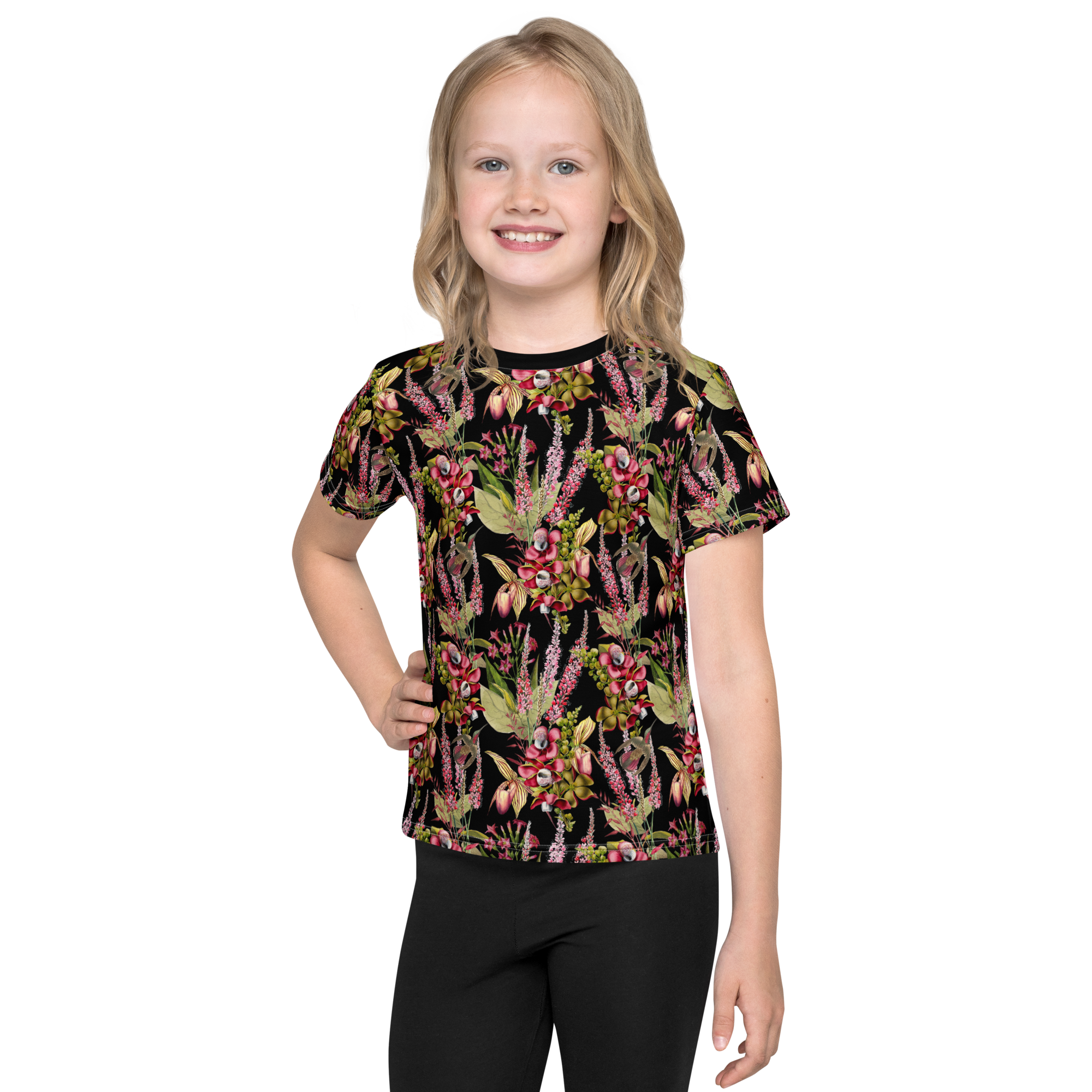 Pink Blossom Kid's Crew Neck T-shirt - Small Print - Black