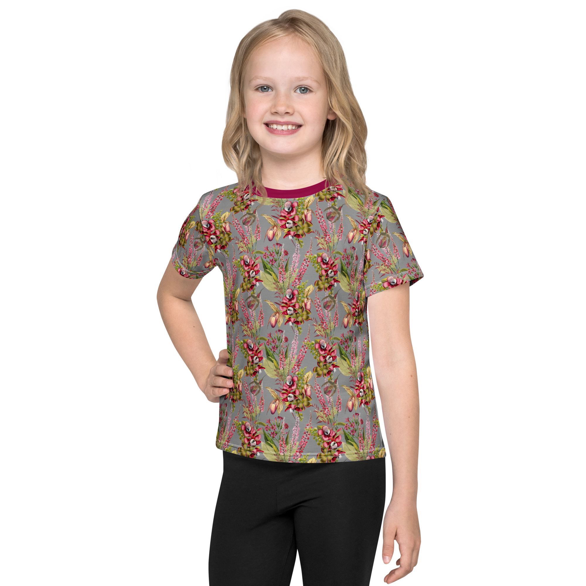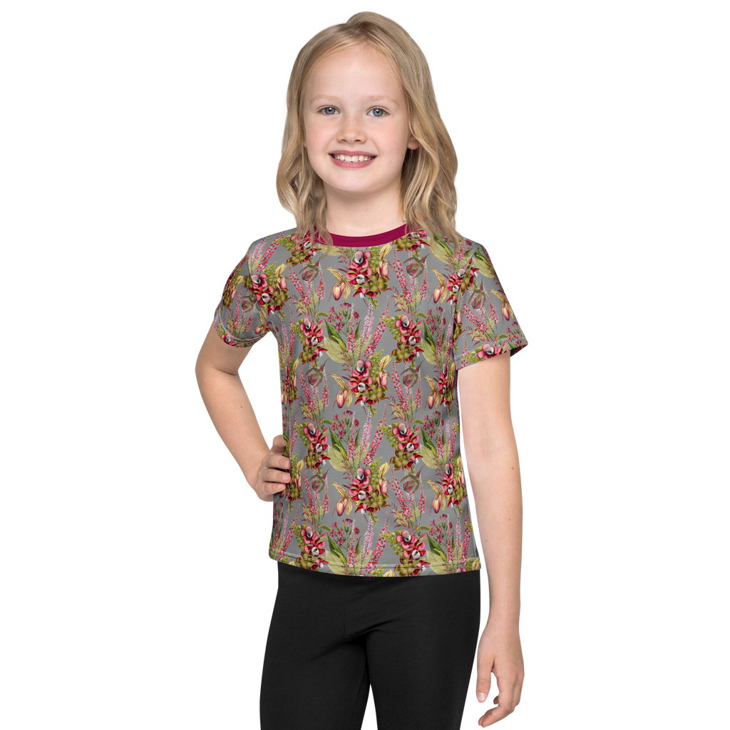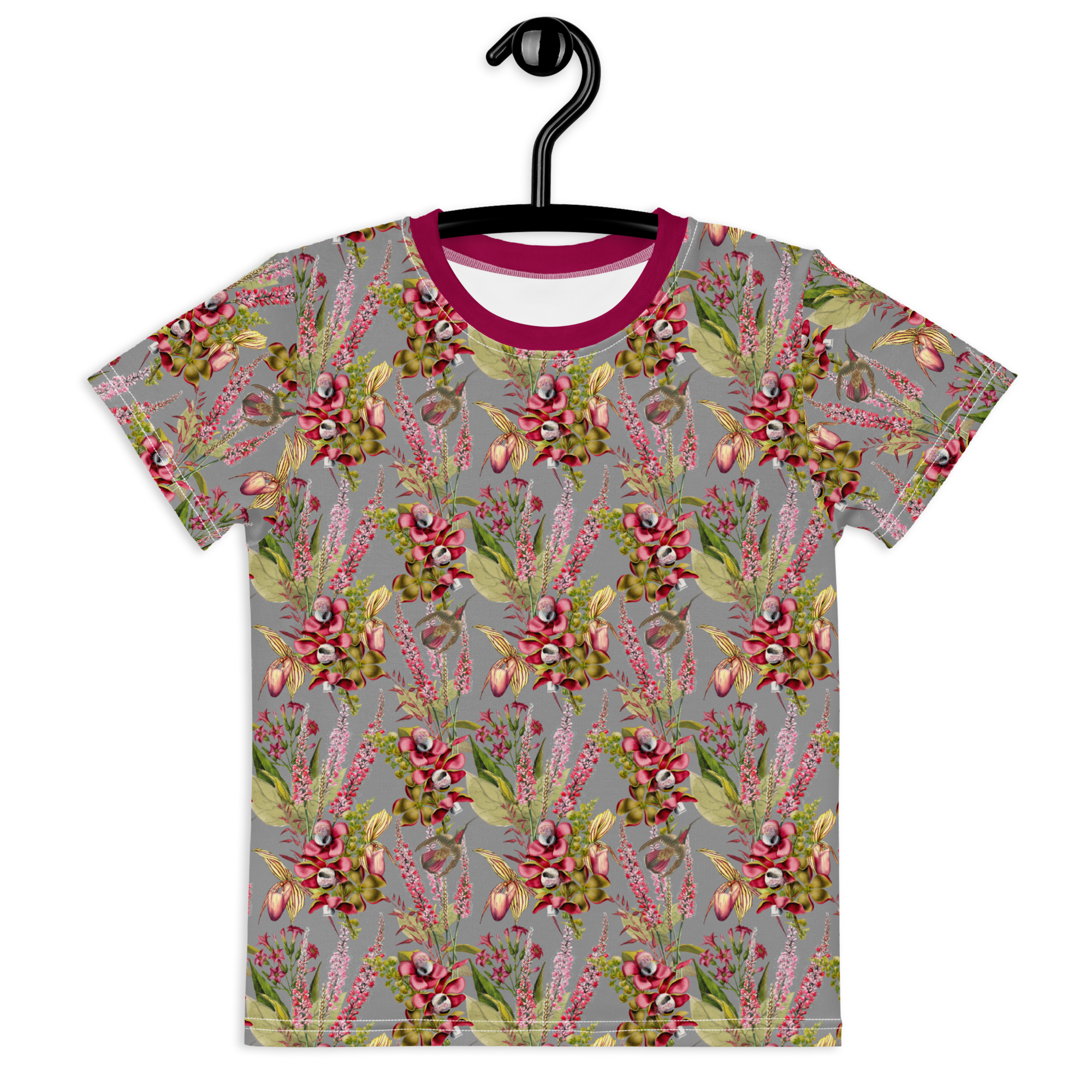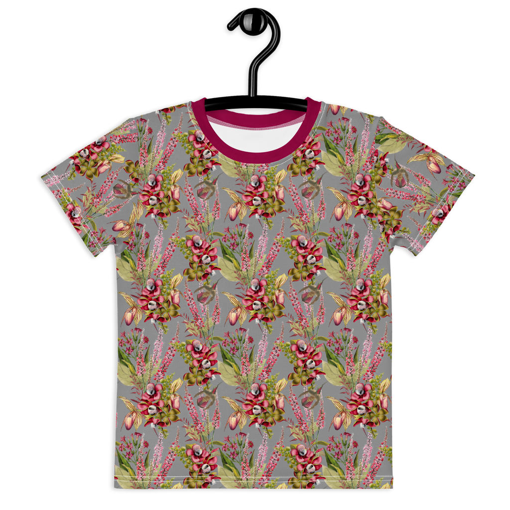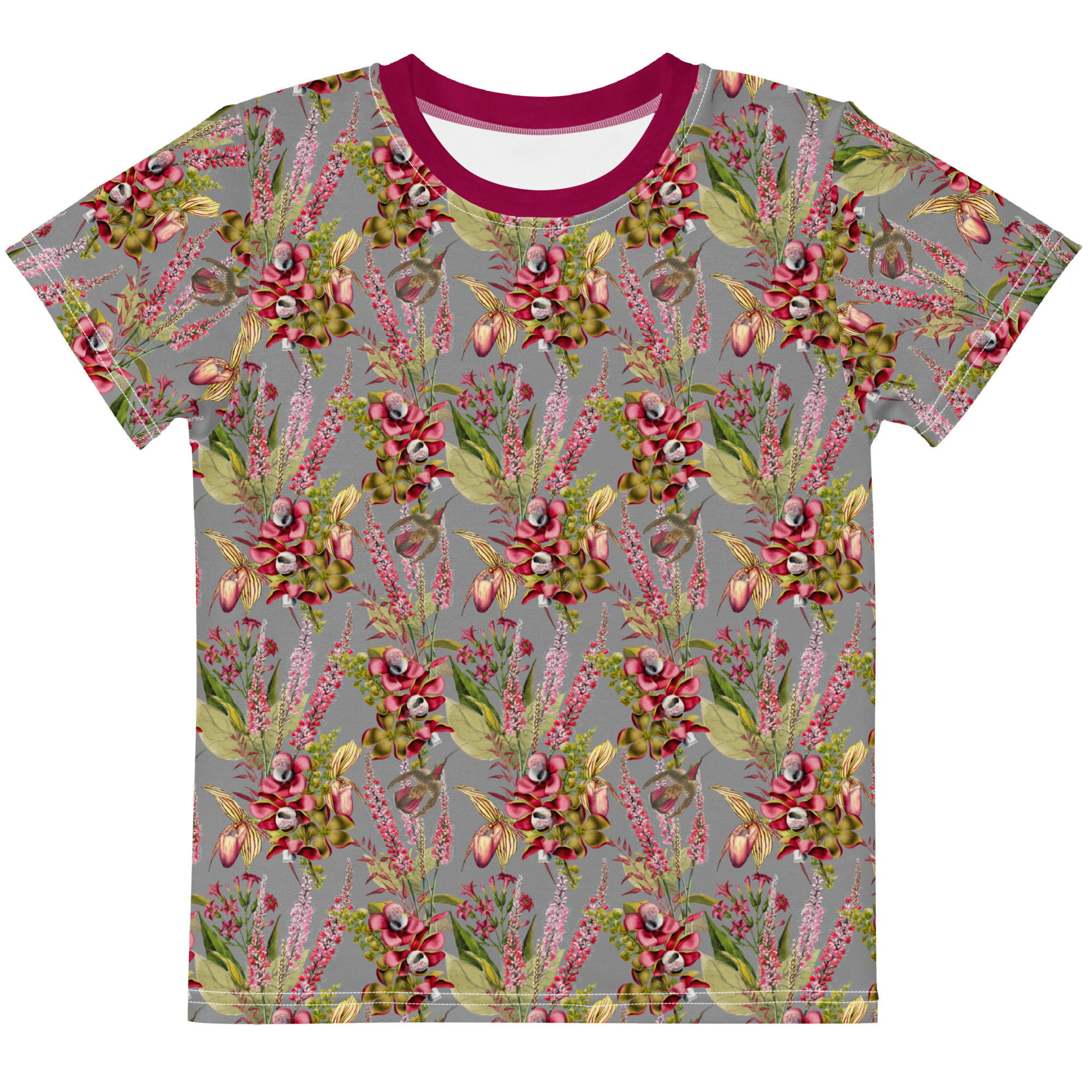 Pink Blossom Kid's Crew Neck T-shirt - X-small Print - Nobel/Burgundy Trim