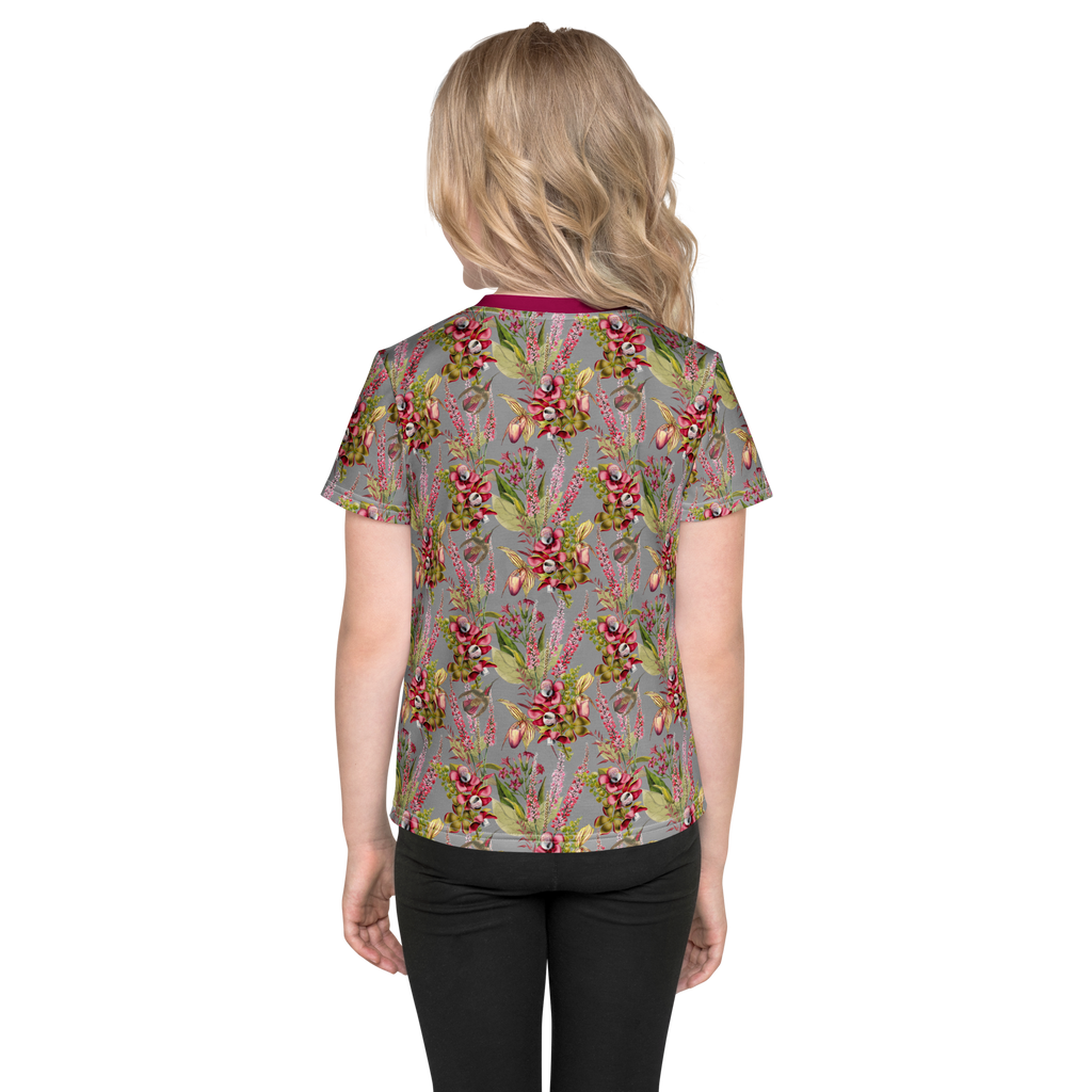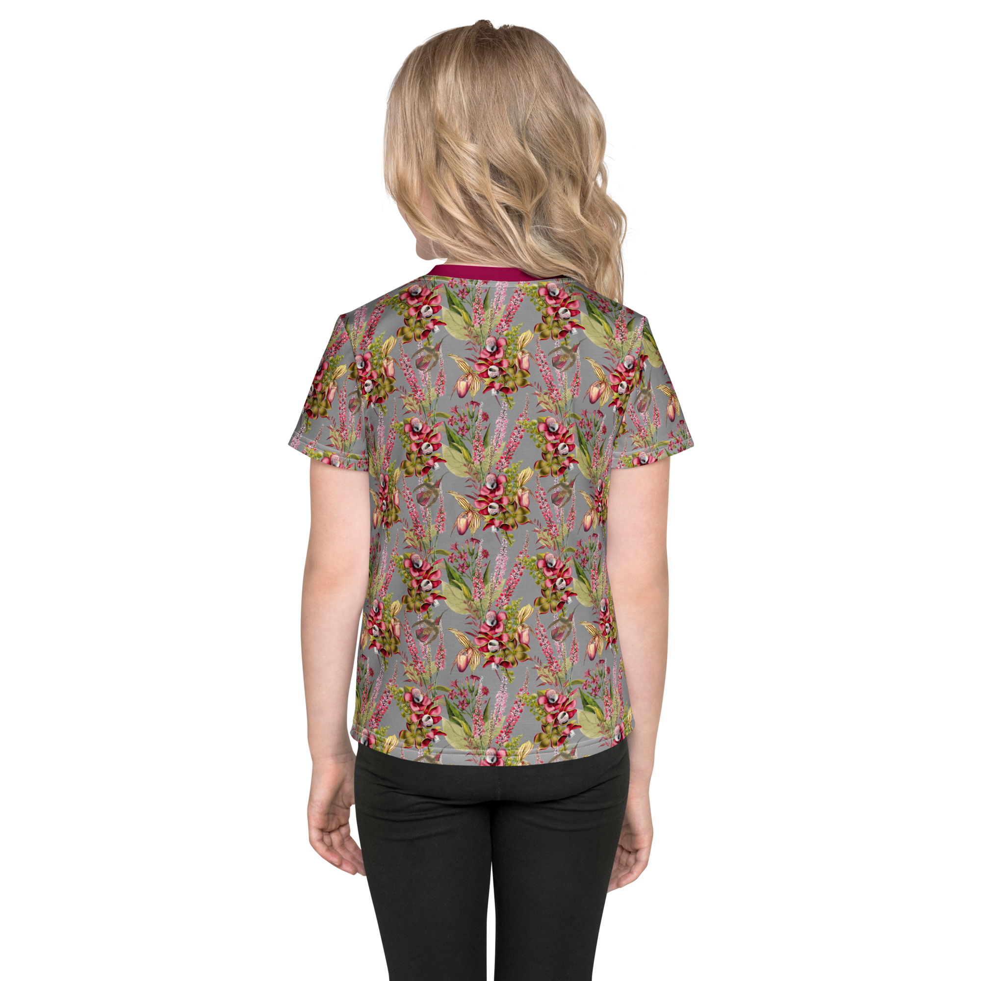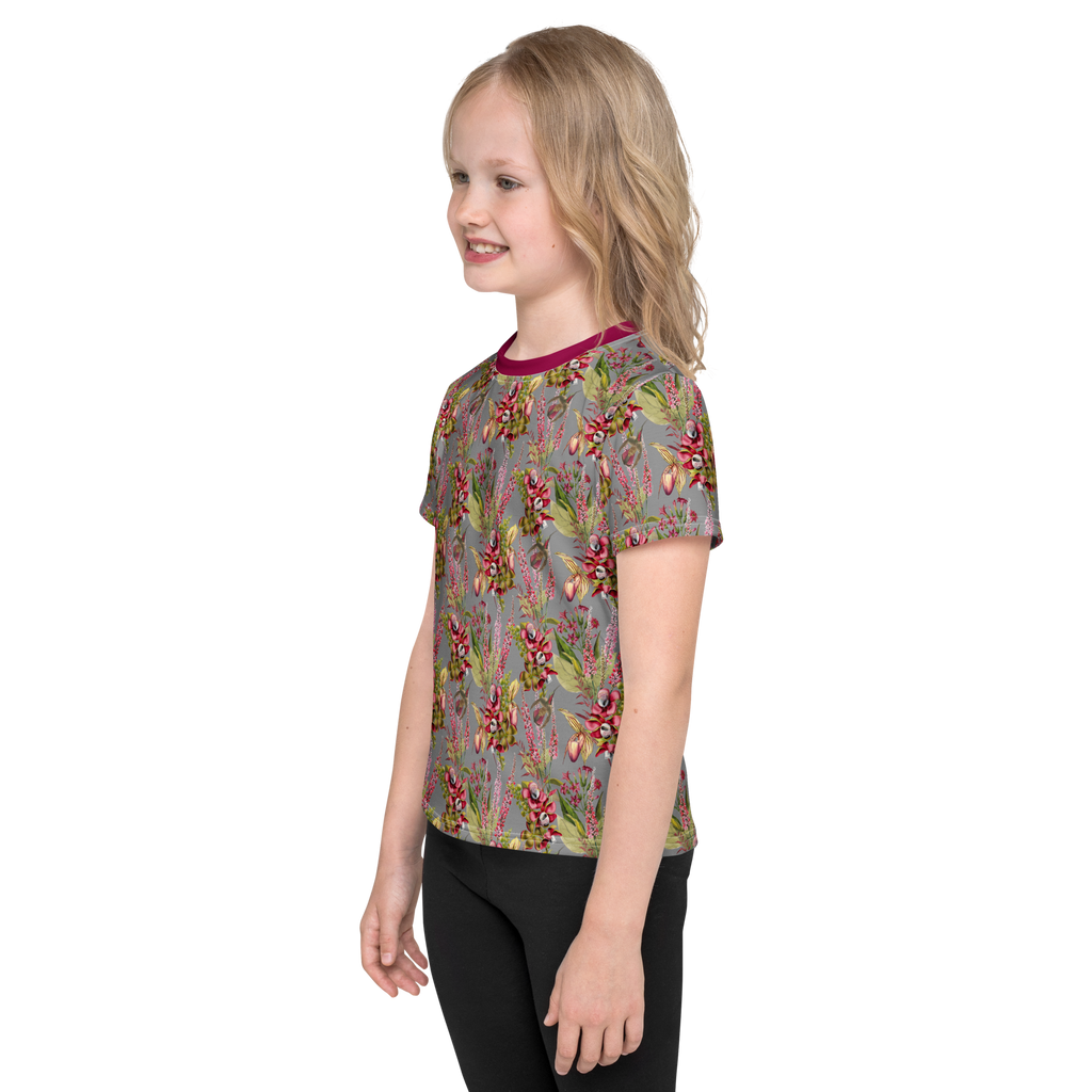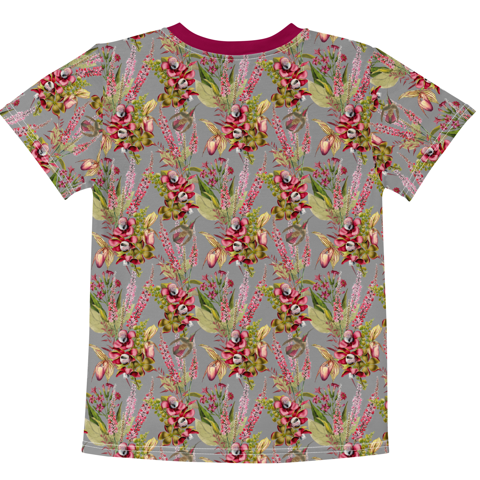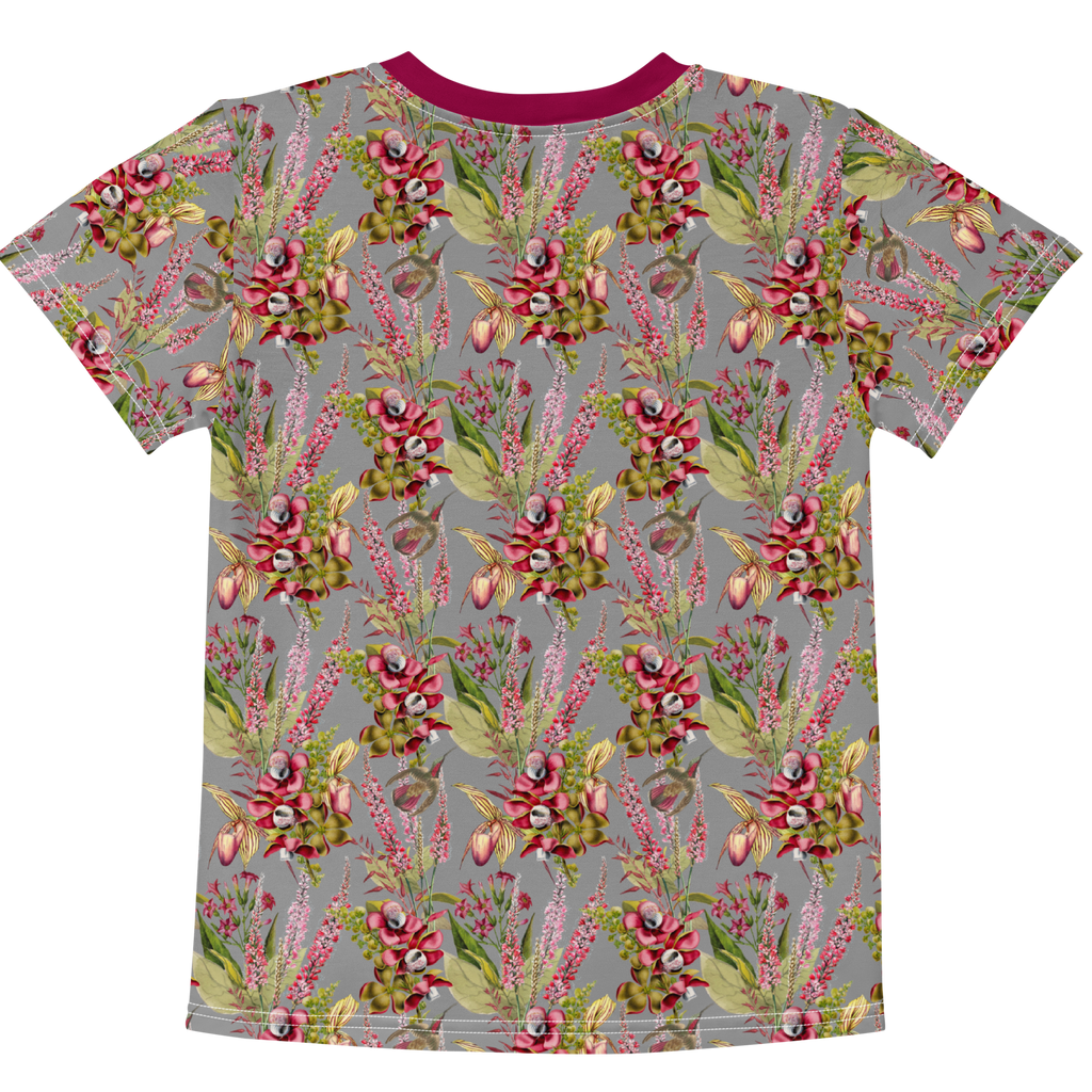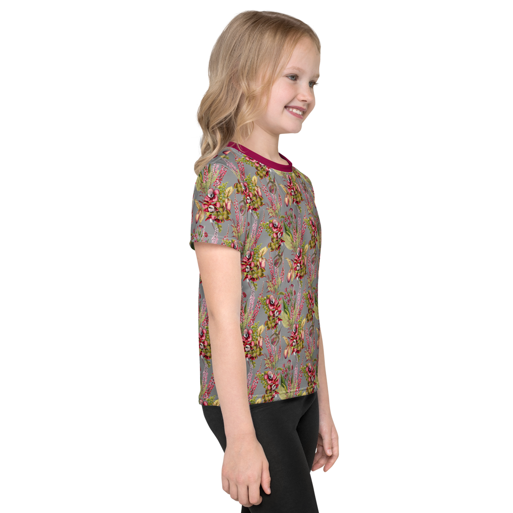 Pink Blossom Kid's Crew Neck T-shirt - X-small Print - Nobel/Burgundy Trim